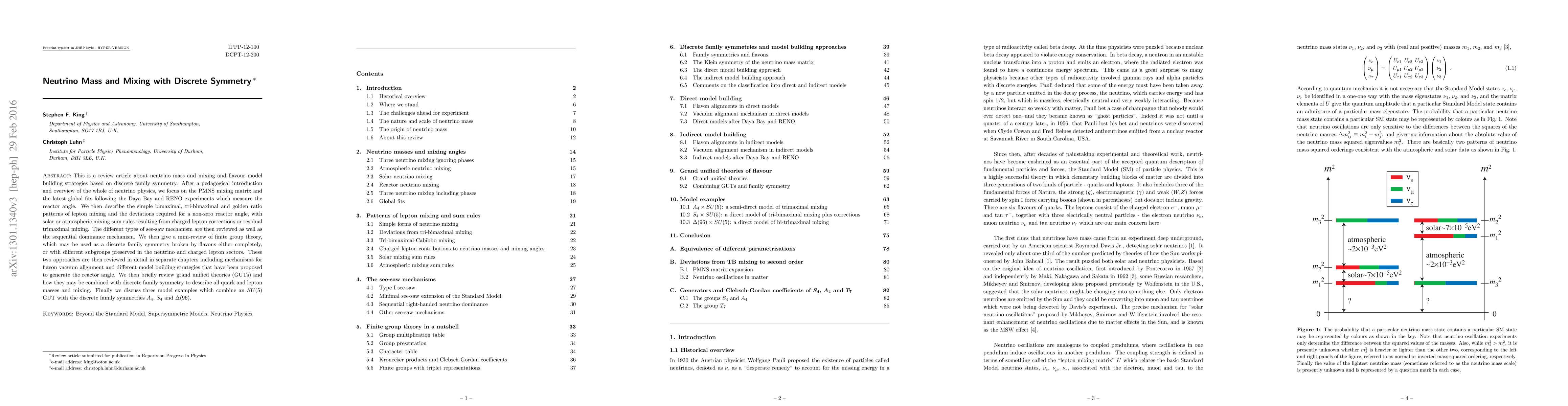 This paper reviews neutrino mass and mixing models based on discrete family symmetry, focusing on the PMNS matrix and see-saw mechanisms, and explores finite group theory and GUTs for generating lepton mixing patterns, including specific examples with A4, S4, and Delta(96) symmetries.