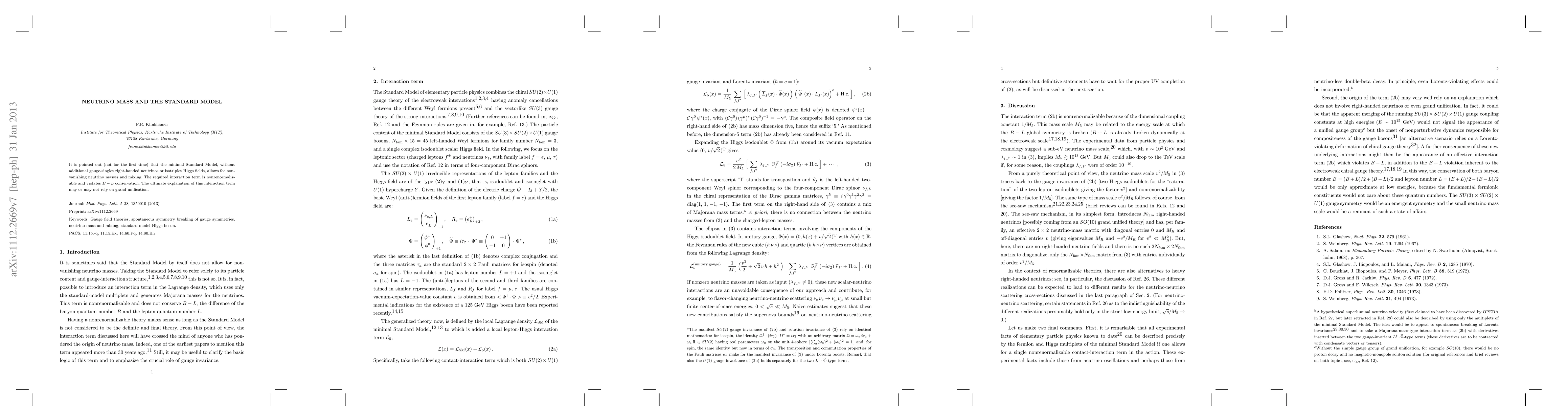 The Standard Model can produce non-vanishing neutrino masses without additional particles through a non-renormalizable interaction term that violates global B-L symmetry. This finding raises questions about the ultimate explanation of such interactions in grand unification theories.