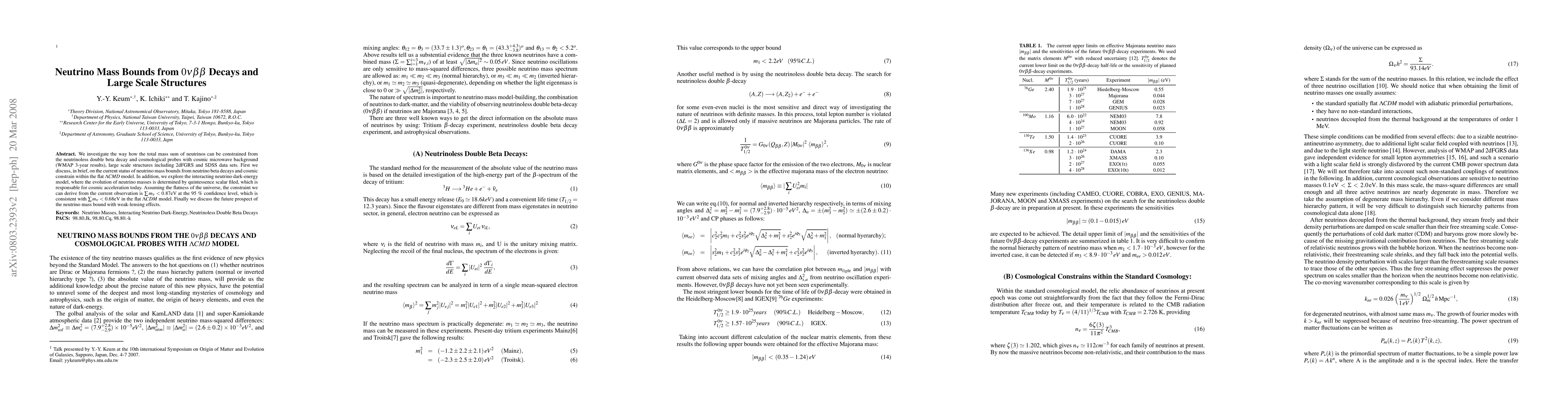 We investigate the way how the total mass sum of neutrinos can be constrained from the neutrinoless double beta decay and cosmological probes with cosmic microwave background (WMAP 3-year results), large scale structures including 2dFGRS and SDSS data sets. First we discuss, in brief, on the current status of neutrino mass bounds from neutrino beta decays and cosmic constrain within the flat $\Lambda CMD$ model. In addition, we explore the interacting neutrino dark-energy model, where the evolution of neutrino masses is determined by quintessence scalar filed, which is responsable for cosmic acceleration today. Assuming the flatness of the universe, the constraint we can derive from the current observation is $\sum m_{\nu} < 0.87$eV at the 95 % confidence level, which is consistent with $\sum m_{\nu} < 0.68$eV in the flat $\Lambda CDM$ model. Finally we discuss the future prospect of the neutrino mass bound with weak-lensing effects.