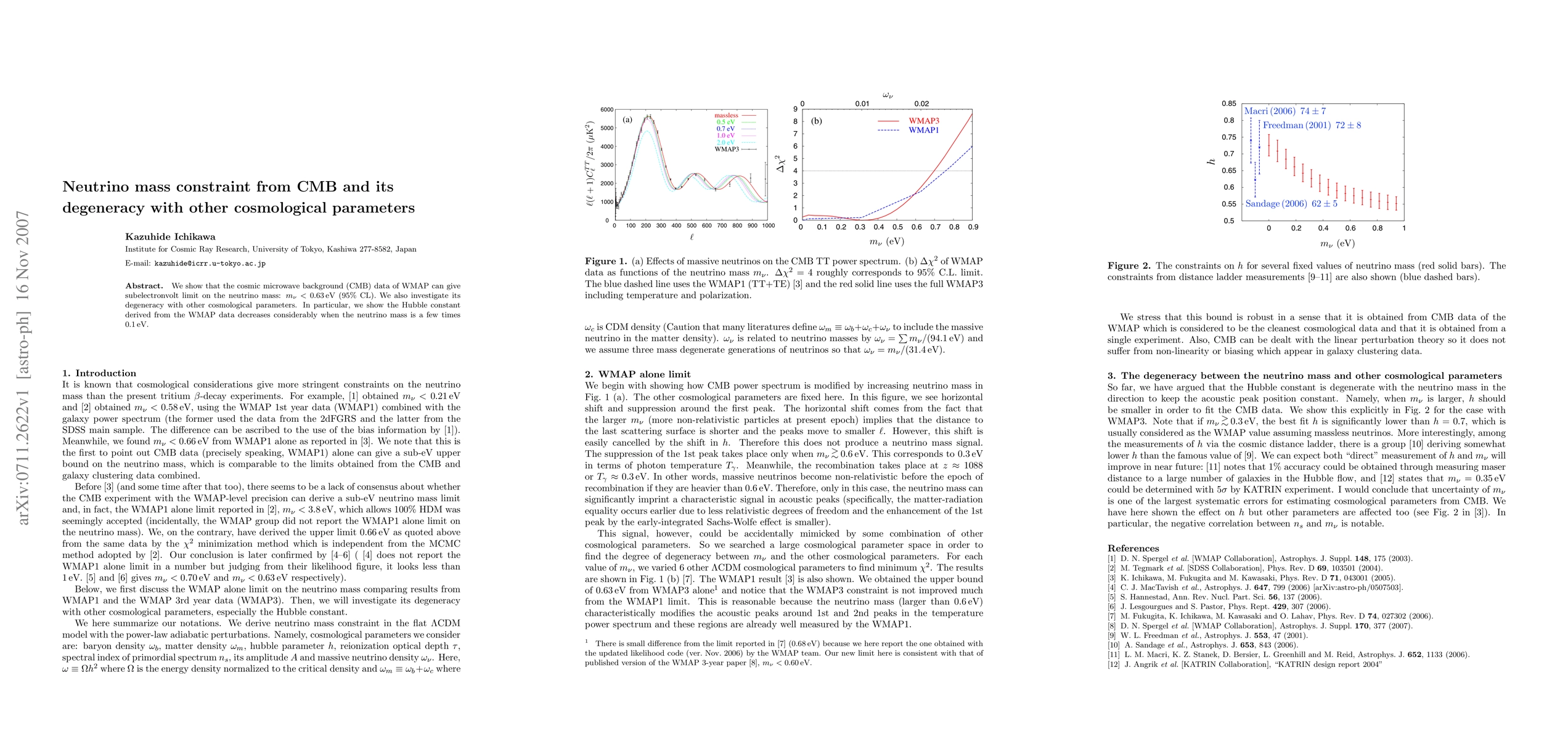 Summary: This paper demonstrates that WMAP CMB data provides a subelectronvolt limit on neutrino mass, constraining it to m_nu < 0.63 eV (95% CL). It also explores the interplay between neutrino mass and other cosmological parameters, notably finding a significant decrease in the Hubble constant when neutrino mass is around 0.1 eV.