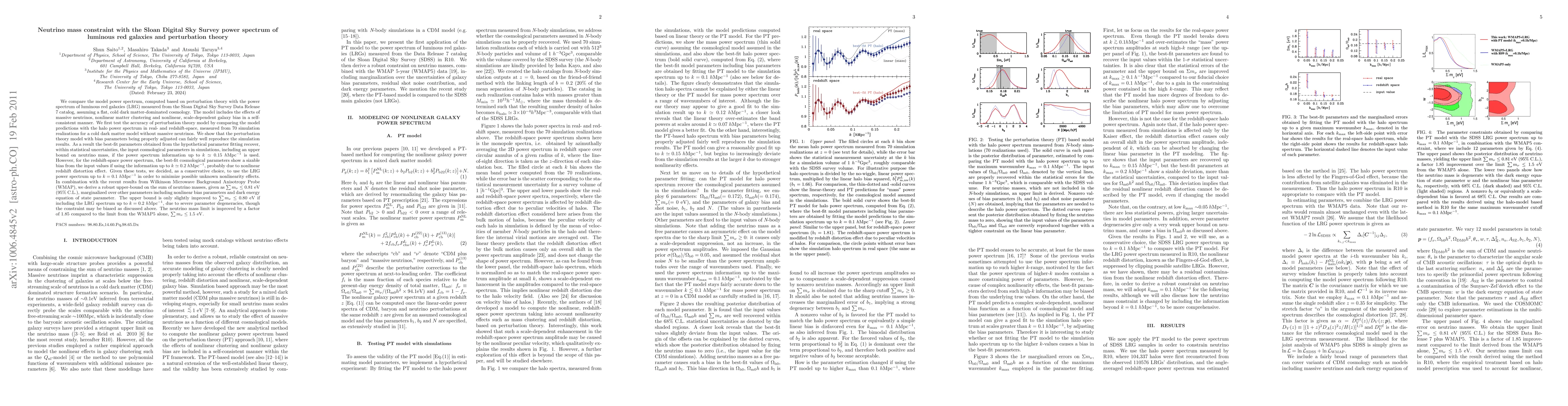 We compare the model power spectrum, computed based on perturbation theory (PT) with the power spectrum of luminous red galaxies (LRG) measured from the SDSSDR7 catalog, assuming a flat, CDM-dominated cosmology. The model includes the effects of massive neutrinos, nonlinear matter clustering and nonlinear, scale-dependent galaxy bias in a self-consistent manner. We first test the accuracy of PT-model by comparing the model predictions with the halo power spectrum in real- and redshift-space measured from simulations without massive neutrinos. We show that the PT-model with bias parameters being properly adjusted can fairly well reproduce the simulation results. As a result the best-fit parameters obtained from the hypothetical parameter fitting recover, within statistical uncertainties, the input cosmological parameters in simulations, including an upper bound on neutrino mass, if the power spectrum information up to k~0.15h/Mpc is used. However, for the redshift-space power spectrum, the best-fit cosmological parameters show a sizable bias from the input values if using the information up to k~0.2h/Mpc, probably due to nonlinear redshift distortion effect. Given these tests, we decided, as a conservative choice, to use the LRG power spectrum up to k=0.1h/Mpc in order to minimize possible unknown nonlinearity effects. In combination with the recent results from Wilkinson Microwave Background Anisotropy Probe (WMAP), we derive a robust upper-bound on the sum of neutrino masses, given as m_nu,tot < 0.81eV (95% C.L.), marginalized over other parameters including nonlinear bias parameters and dark energy equation of state parameter. The neutrino mass limit is improved by a factor of 1.85 compared to the limit from the WMAP5 alone, m_nu,tot < 1.5eV.