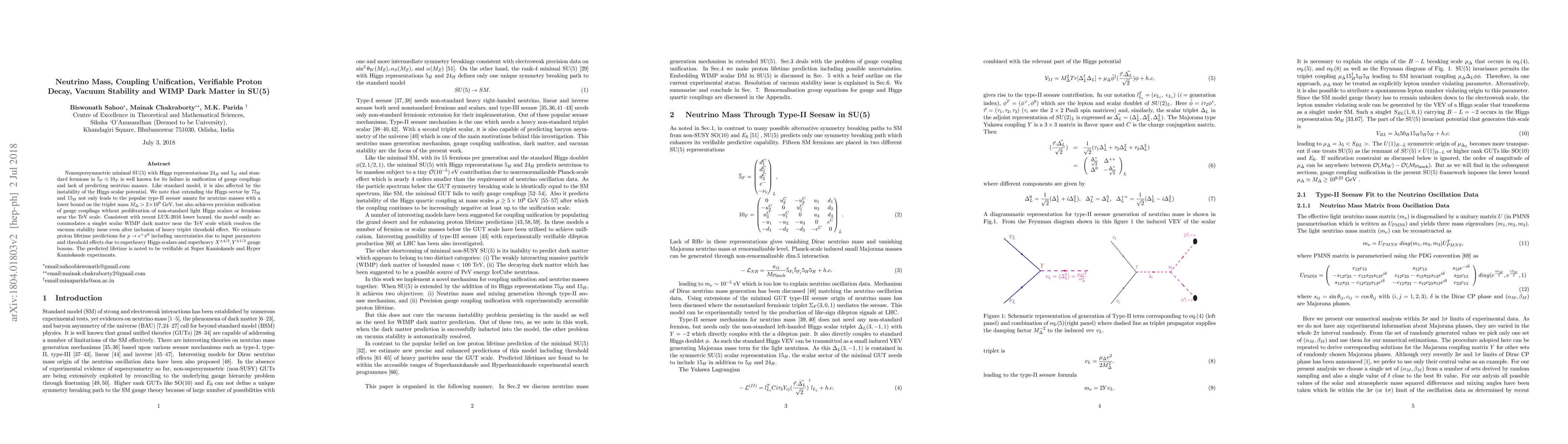 This paper explores an extended nonsupersymmetric minimal SU(5) model with additional Higgs representations to achieve gauge coupling unification, neutrino mass generation via type-II seesaw, and vacuum stability. It predicts verifiable proton decay and singlet scalar WIMP dark matter near the TeV scale, with a proton lifetime estimable by upcoming Super Kamiokande and Hyper Kamiokande experiments.