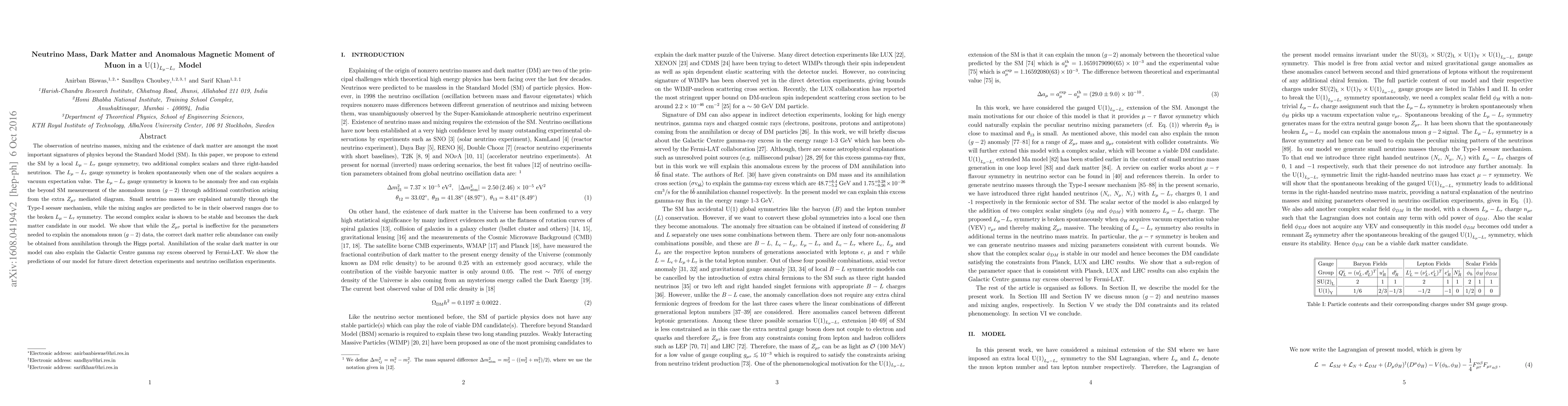 This paper proposes an extension of the Standard Model by introducing a local $U(1)_{L_{\mu}-L_{\tau}}$ gauge symmetry, additional scalars, and right-handed neutrinos to explain neutrino masses, dark matter, and the anomalous magnetic moment of the muon. The model naturally explains small neutrino masses via the Type-I seesaw mechanism and predicts the dark matter candidate through the stability of a second complex scalar.