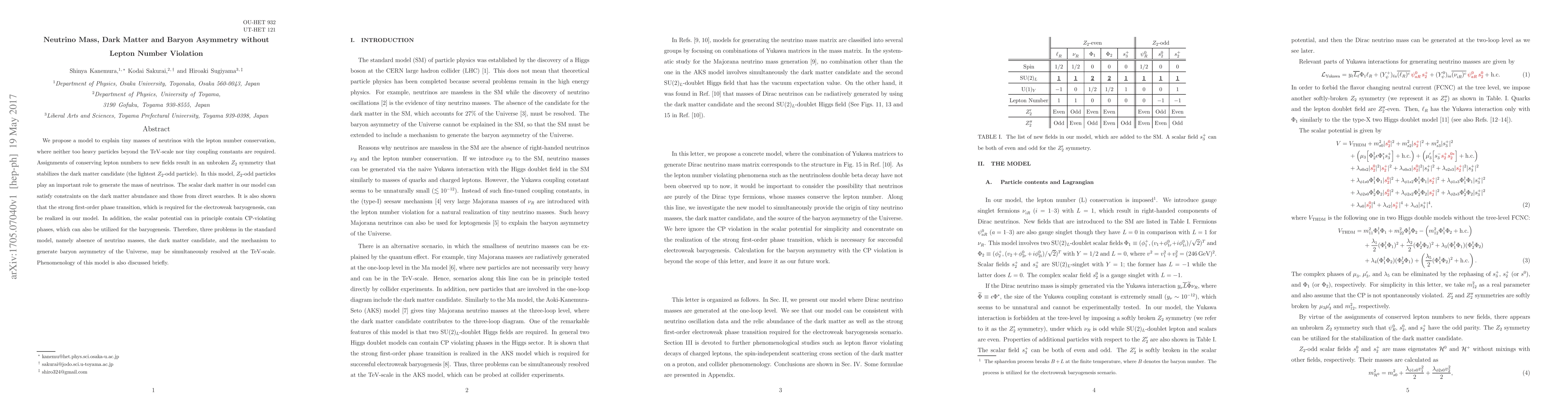 This paper proposes a model to explain neutrino masses without violating lepton number, featuring a stable dark matter candidate and a mechanism for generating baryon asymmetry without requiring heavy particles or small coupling constants. The model utilizes a $Z_2$ symmetry and CP-violating phases to address these three issues in the standard model simultaneously.