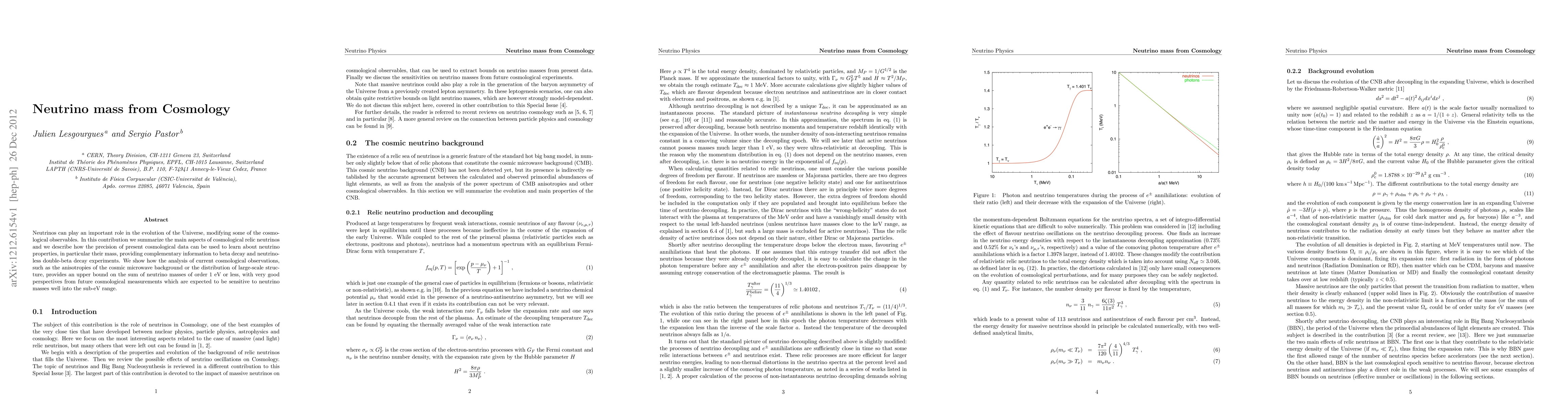 Neutrinos can play an important role in the evolution of the Universe, modifying some of the cosmological observables. In this contribution we summarize the main aspects of cosmological relic neutrinos and we describe how the precision of present cosmological data can be used to learn about neutrino properties, in particular their mass, providing complementary information to beta decay and neutrinoless double-beta decay experiments. We show how the analysis of current cosmological observations, such as the anisotropies of the cosmic microwave background or the distribution of large-scale structure, provides an upper bound on the sum of neutrino masses of order 1 eV or less, with very good perspectives from future cosmological measurements which are expected to be sensitive to neutrino masses well into the sub-eV range.