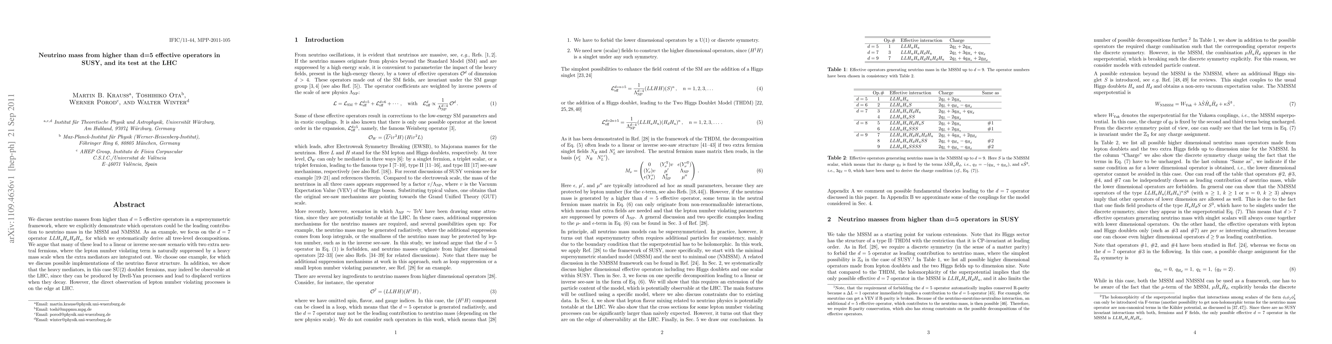 This paper explores neutrino mass generation in supersymmetric frameworks through higher-order effective operators, discussing possible LHC detection at the expense of observing lepton number violating processes.