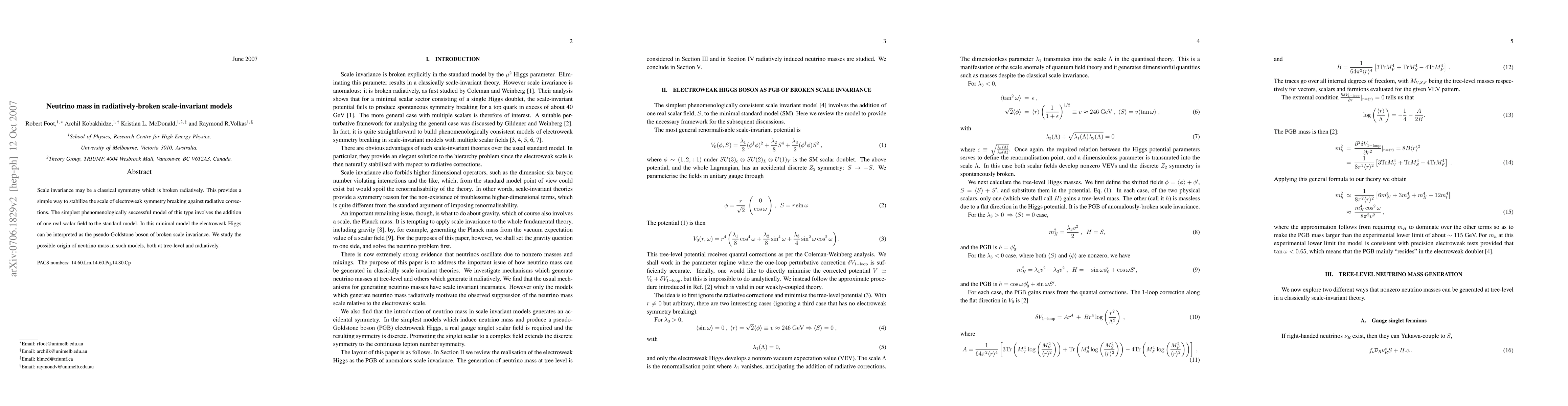 Scale invariance may be a classical symmetry which is broken radiatively. This provides a simple way to stabilize the scale of electroweak symmetry breaking against radiative corrections. The simplest phenomenologically successful model of this type involves the addition of one real scalar field to the standard model. In this minimal model the electroweak Higgs can be interpreted as the pseudo-Goldstone boson of broken scale invariance. We study the possible origin of neutrino mass in such models, both at tree-level and radiatively.