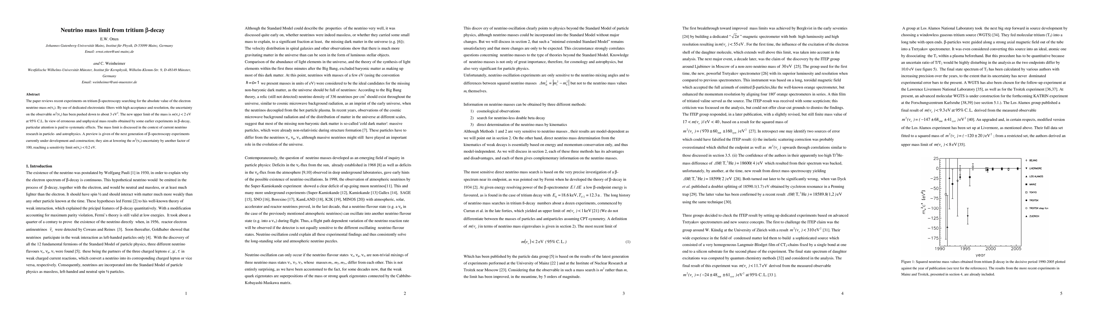 This paper reports a refined limit on the electron neutrino mass from tritium beta decay experiments, achieving a new upper limit of $m(\nu_e) < 2$ eV at 95% C.L. Future experiments aim to reduce this uncertainty by a factor of 100, targeting a sensitivity limit of $m(\nu_e) < 0.2$ eV.