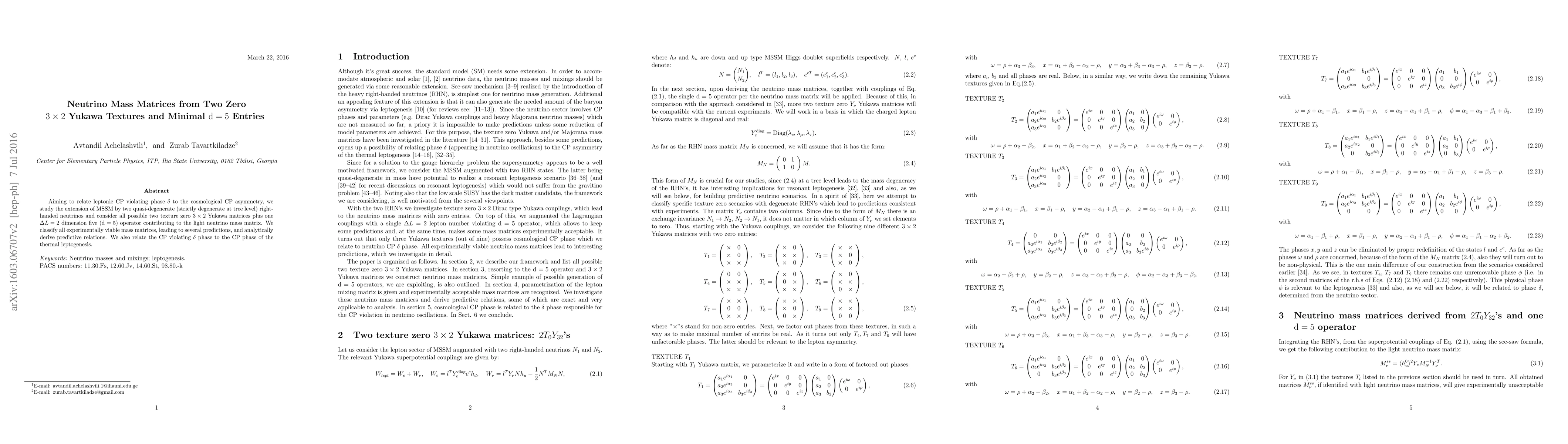 Aiming to relate leptonic CP violating phase $\delta $ to the cosmological CP asymmetry, we study the extension of MSSM by two quasi-degenerate (strictly degenerate at tree level) right-handed neutrinos and consider all possible two texture zero 3x2 Yukawa matrices plus one $\Delta L=2$ dimension five (d=5) operator contributing to the light neutrino mass matrix. We classify all experimentally viable mass matrices, leading to several predictions, and analytically derive predictive relations. We also relate the CP violating $\delta$ phase to the CP phase of the thermal leptogenesis.