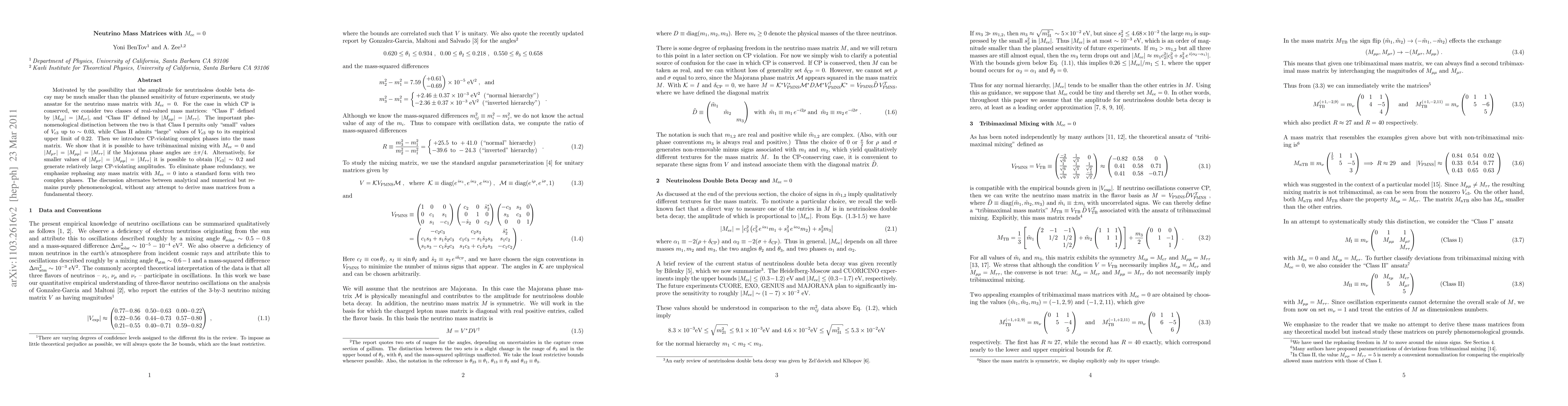 Motivated by the possibility that the amplitude for neutrinoless double beta decay may be much smaller than the planned sensitivity of future experiments, we study ansatze for the neutrino mass matrix with $M_{ee} = 0$. For the case in which CP is conserved, we consider two classes of real-valued mass matrices: "Class I" defined by $|M_{e\mu}| = |M_{e\tau}|$, and "Class II" defined by $|M_{\mu\mu}| = |M_{\tau\tau}|$. The important phenomenological distinction between the two is that Class I permits only "small" values of $V_{e3}$ up to $\sim 0.03$, while Class II admits "large" values of $V_{e3}$ up to its empirical upper limit of 0.22. Then we introduce CP-violating complex phases into the mass matrix. We show that it is possible to have tribimaximal mixing with $M_{ee} = 0$ and $|M_{\mu\tau}| = |M_{\mu\mu}| = |M_{\tau\tau}|$ if the Majorana phase angles are $\pm\pi/4$. Alternatively, for smaller values of $|M_{\mu\tau}| = |M_{\mu\mu}| = |M_{\tau\tau}|$ it is possible to obtain $|V_{e3}| \sim 0.2$ and generate relatively large CP-violating amplitudes. To eliminate phase redundancy, we emphasize rephasing any mass matrix with $M_{ee} = 0$ into a standard form with two complex phases. The discussion alternates between analytical and numerical but remains purely phenomenological, without any attempt to derive mass matrices from a fundamental theory.