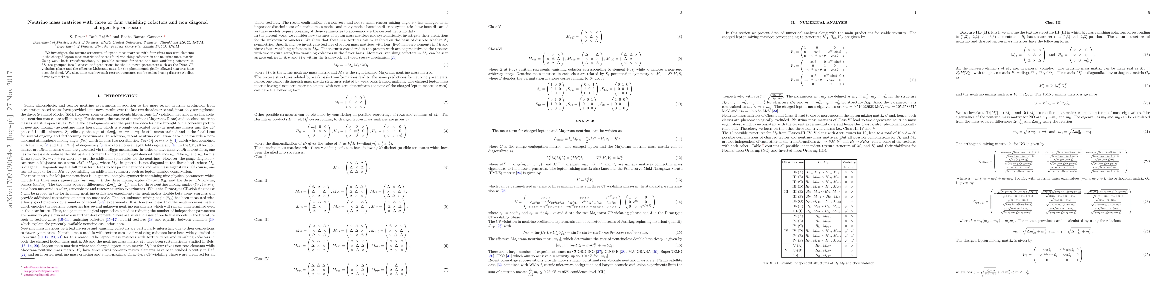 We investigate the texture structures of lepton mass matrices with four (five) non-zero elements in the charged lepton mass matrix and three (four) vanishing cofactors in the neutrino mass matrix. Using weak basis transformations, all possible textures for three and four vanishing cofactors in $M_{\nu}$ are grouped into 7 classes and predictions for the unknown parameters such as the Dirac CP violating phase and the effective Majorana mass for the phenomenologically allowed textures have been obtained. We, also, illustrate how such texture structures can be realized using discrete Abelian flavor symmetries.