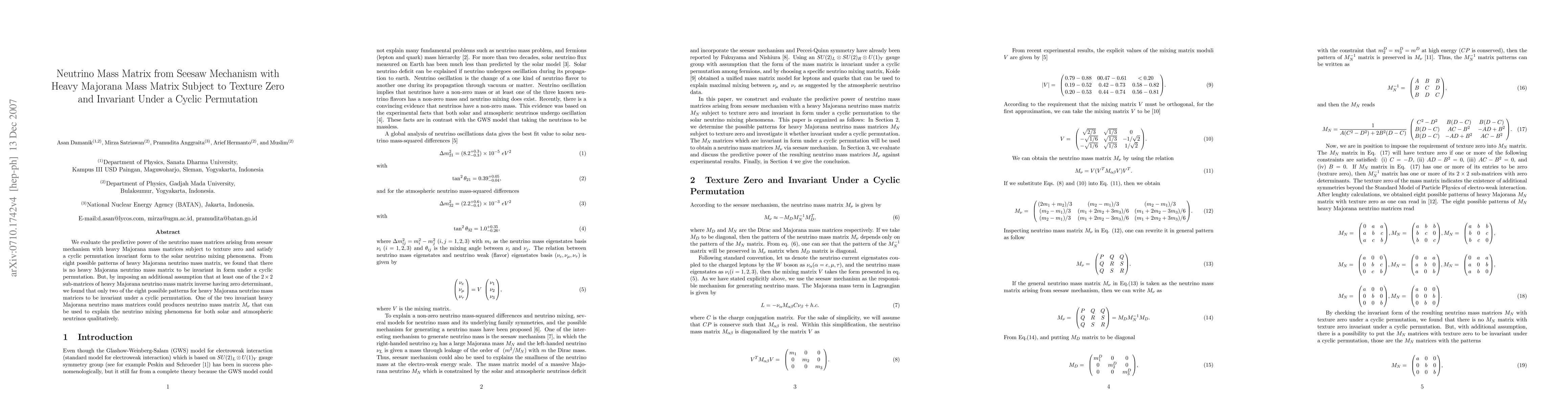 This paper investigates neutrino mass matrices derived from the seesaw mechanism with heavy Majorana neutrinos under texture zero and cyclic permutation invariance. It finds that only two out of eight possible patterns satisfy these conditions, with one potentially explaining both solar and atmospheric neutrino mixing phenomena.