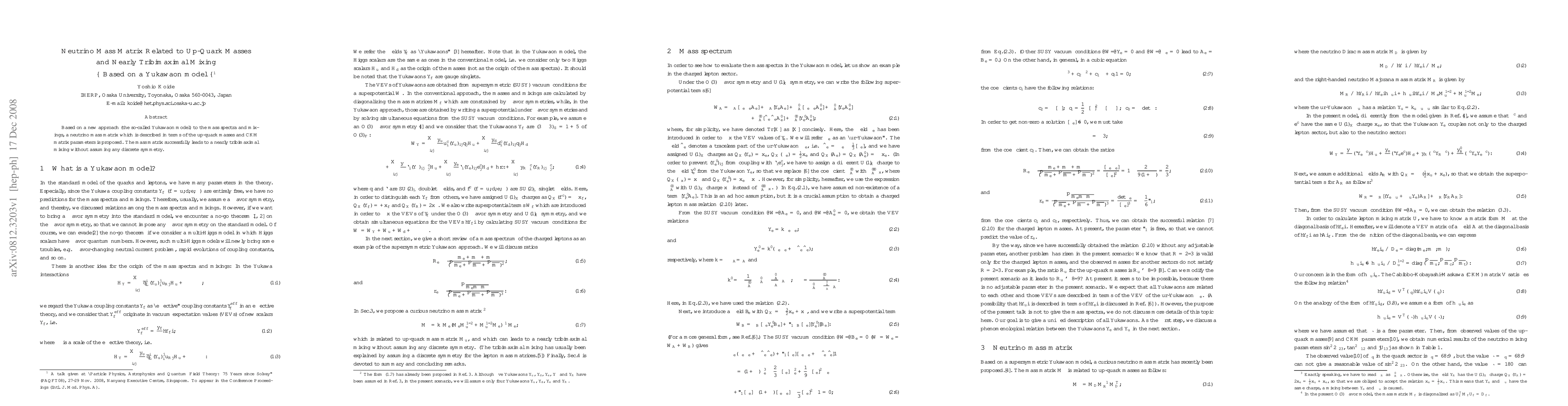 Based on a new approach (the so-called Yukawaon model) to the mass spectra and mixings, a neutrino mass matrix which is described in terms of the up-quark masses and CKM matrix parameters is proposed. The mass matrix successfully leads to a nearly tribimaximal mixing without assuming any discrete symmetry.