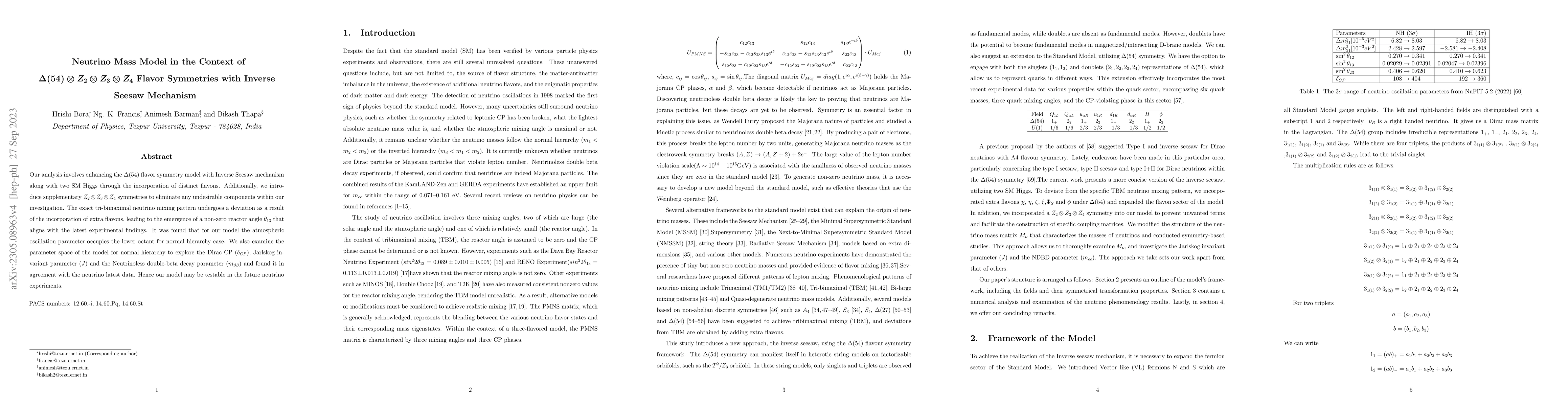 This paper proposes a neutrino mass model using $\Delta(54)$ flavor symmetry enhanced by the Inverse Seesaw mechanism and additional $Z_2\otimes Z_3 \otimes Z_4$ symmetries. It predicts a non-zero reactor angle $\theta_{13}$ consistent with experimental data and suggests the atmospheric oscillation parameter lies in the lower octant for normal hierarchy.