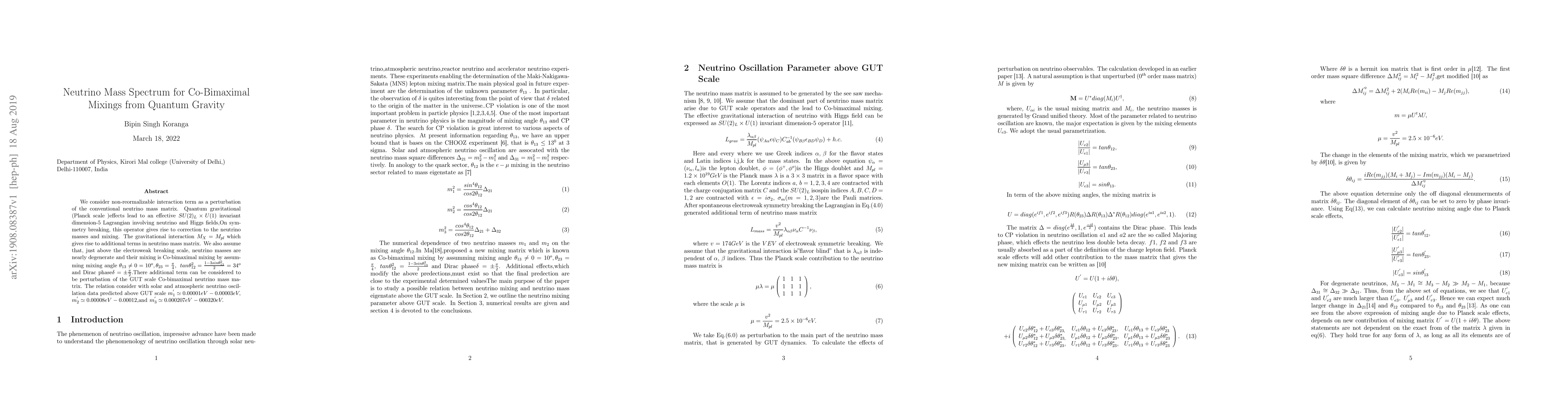 We consider non-renormalizable interaction term as a perturbation of the conventional neutrino mass matrix. Quantum gravitational (Planck scale )effects lead to an effective $SU(2)_L\times U(1)$ invariant dimension-5 Lagrangian involving neutrino and Higgs fields,On symmetry breaking, this operator gives rise to correction to the neutrino masses and mixing. The gravitational interaction $M_X=M_{pl}$ which gives rise to additional terms in neutrino mass matrix. We also assume that, just above the electroweak breaking scale, neutrino masses are nearly degenerate and their mixing is Co-bimaximal mixing by assuming mixing angle $\theta_{13}\neq0 = 10^{o}$, $\theta_{23}=\frac{\pi}{4}$, $\tan\theta_{12}^ 2 = \frac{1-3sin\theta_{13}^2}{2} = 34^{o}$ and Dirac phase $\delta=\pm\frac{\pi}{2}$.There additional term can be considered to be perturbation of the GUT scale Co-bimaximal neutrino mass matrix. The relation consider with solar and atmospheric neutrino oscillation data predicted above GUT scale $m_1' \simeq 0.00001eV-0.00003eV$, $m_2' \simeq 0.00008eV-0.00012$, and $m_3' \simeq 0.000207eV-000320eV$.