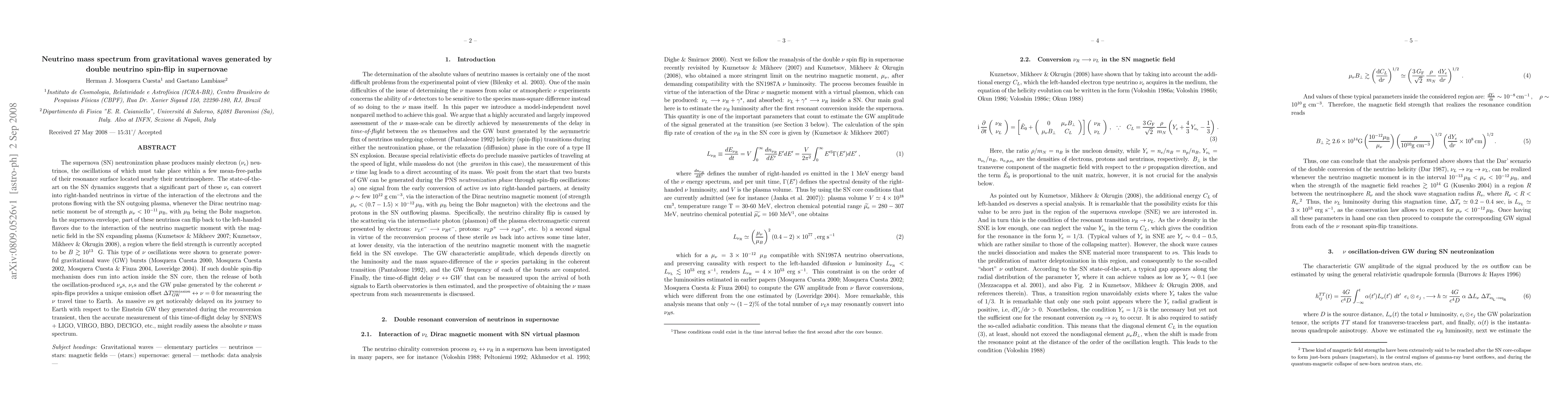 The supernova (SN) neutronization phase produces mainly electron ($\nu_e$) neutrinos, the oscillations of which must take place within a few mean-free-paths of their resonance surface located nearby their neutrinosphere. The state-of-the-art on the SN dynamics suggests that a significant part of these $\nu_e$ can convert into right-handed neutrinos in virtue of the interaction of the electrons and the protons flowing with the SN outgoing plasma, whenever the Dirac neutrino magnetic moment be of strength $\mu_\nu < 10^{-11} \mu_{\rm B}$, with $\mu_{\rm B}$ being the Bohr magneton. In the supernova envelope, part of these neutrinos can flip back to the left-handed flavors due to the interaction of the neutrino magnetic moment with the magnetic field in the SN expanding plasma (Kuznetsov & Mikheev 2007; Kuznetsov, Mikheev & Okrugin 2008), a region where the field strength is currently accepted to be $B \gtrsim 10^{13}$ ~G. This type of $\nu$ oscillations were shown to generate powerful gravitational wave (GW) bursts (Mosquera Cuesta 2000, Mosquera Cuesta 2002, Mosquera Cuesta & Fiuza 2004, Loveridge 2004). If such double spin-flip mechanism does run into action inside the SN core, then the release of both the oscillation-produced $\nu_\mu$s, $\nu_\tau$s and the GW pulse generated by the coherent $\nu$ spin-flips provides a unique emission offset $\Delta T^{emission}_{\rm GW} \leftrightarrow \nu = 0$ for measuring the $\nu$ travel time to Earth. As massive $\nu$s get noticeably delayed on its journey to Earth with respect to the Einstein GW they generated during the reconversion transient, then the accurate measurement of this time-of-flight delay by SNEWS + LIGO, VIRGO, BBO, DECIGO, etc., might readily assess the absolute $\nu$ mass spectrum.