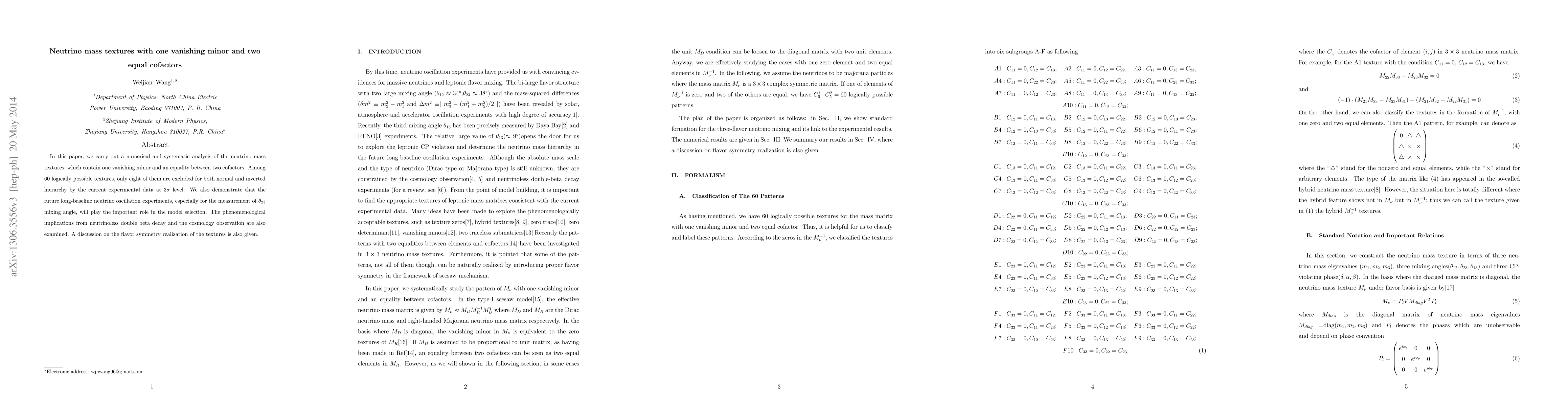 In this paper, we carry out a numerical and systematic analysis of the neutrino mass textures, which contain one vanishing minor and an equality between two cofactors. Among 60 logically possible textures, only eight of them are excluded for both normal and inverted hierarchy by the current experimental data at 3\sigma level. We also demonstrate that the future long-baseline neutrino oscillation experiments, especially for the measurement of \theta 23 mixing angle, will play the important role in the model selection. The phenomenological implications from neutrinoless double beta decay and the cosmology observation are also examined. A discussion on the flavor symmetry realization of the textures is also given.