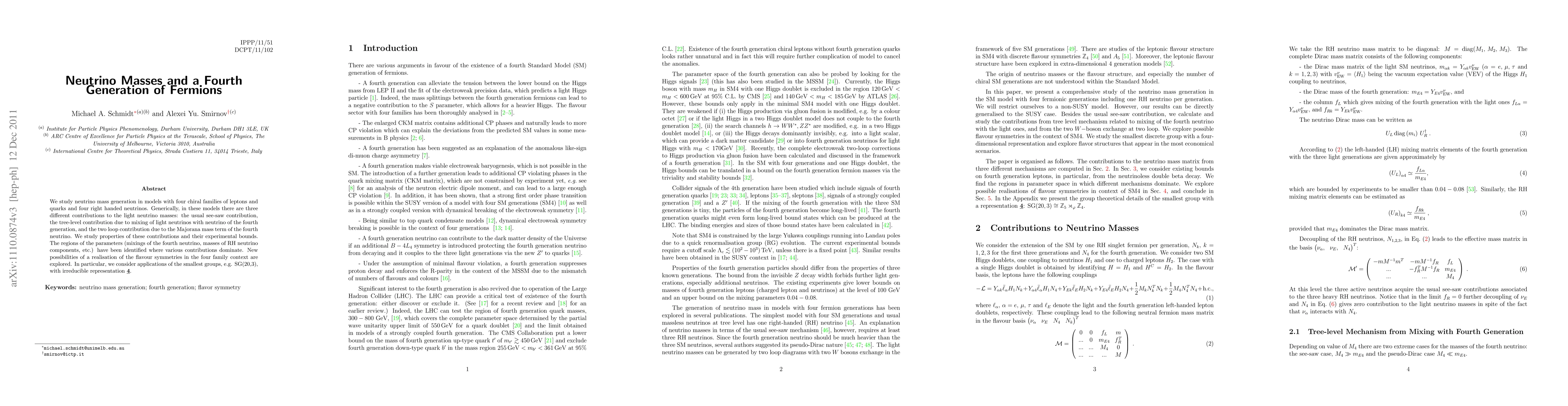 This paper investigates neutrino mass generation in models with four chiral families and four right-handed neutrinos, identifying three contributions to light neutrino masses: see-saw, tree-level mixing, and two-loop Majorana mass effects. It explores the parameter regions where these contributions dominate and examines the potential for flavor symmetries in this four-family framework.