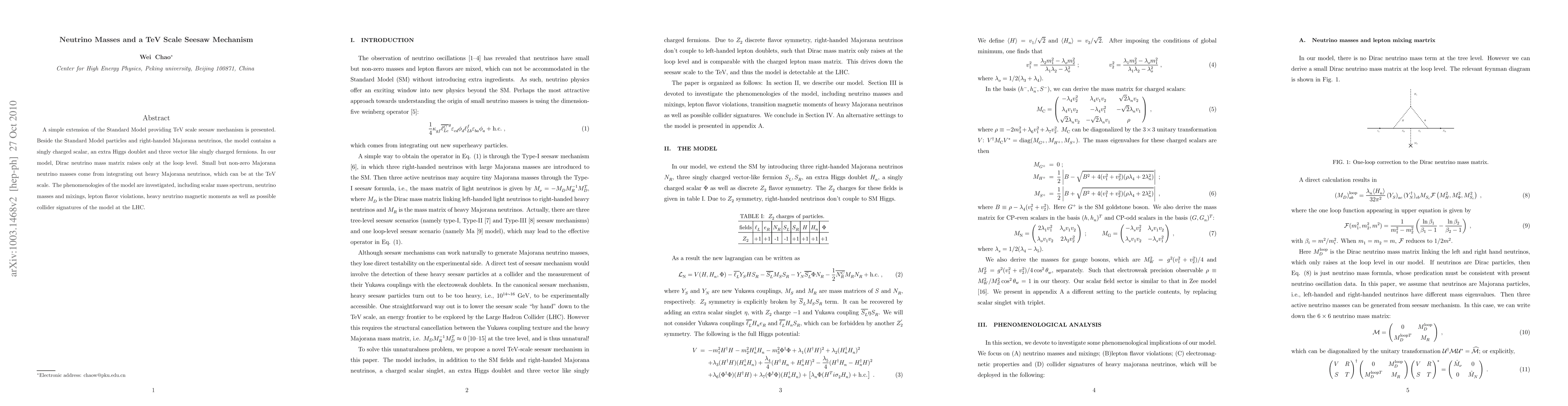 This paper proposes a Standard Model extension featuring a TeV scale seesaw mechanism with right-handed Majorana neutrinos, a singly charged scalar, an extra Higgs doublet, and vector-like fermions. It predicts small Majorana neutrino masses from heavy Majorana neutrinos and explores its phenomenology, including collider signatures at the LHC.