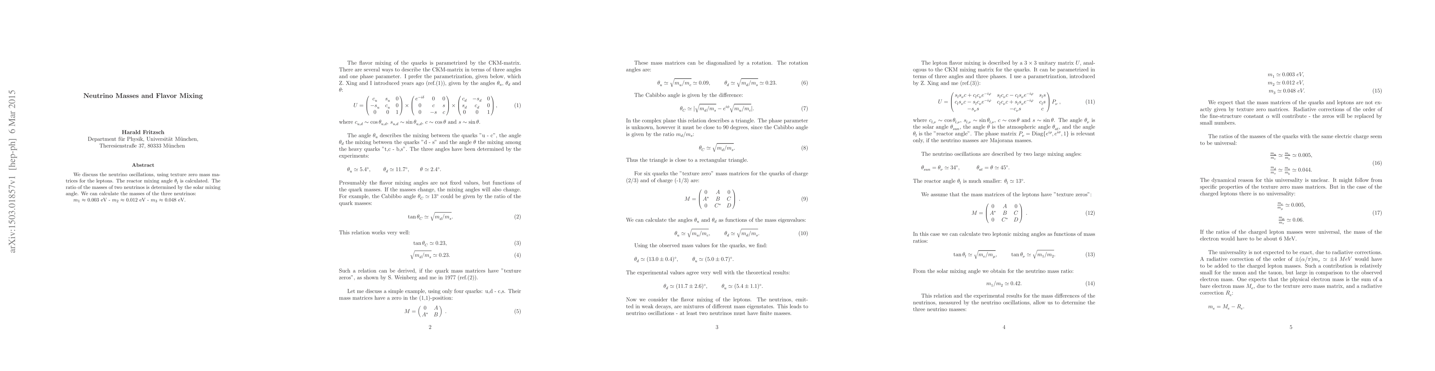 We discuss the neutrino oscillations, using texture zero mass matrices for the leptons. The reactor mixing angle $\theta^{}_{l}$ is calculated. The ratio of the masses of two neutrinos is determined by the solar mixing angle. We can calculate the masses of the three neutrinos: $m_1$ $\approx$ 0.003 eV - $m_2$ $\approx$ 0.012 eV - $m_3$ $\approx$ 0.048 eV.