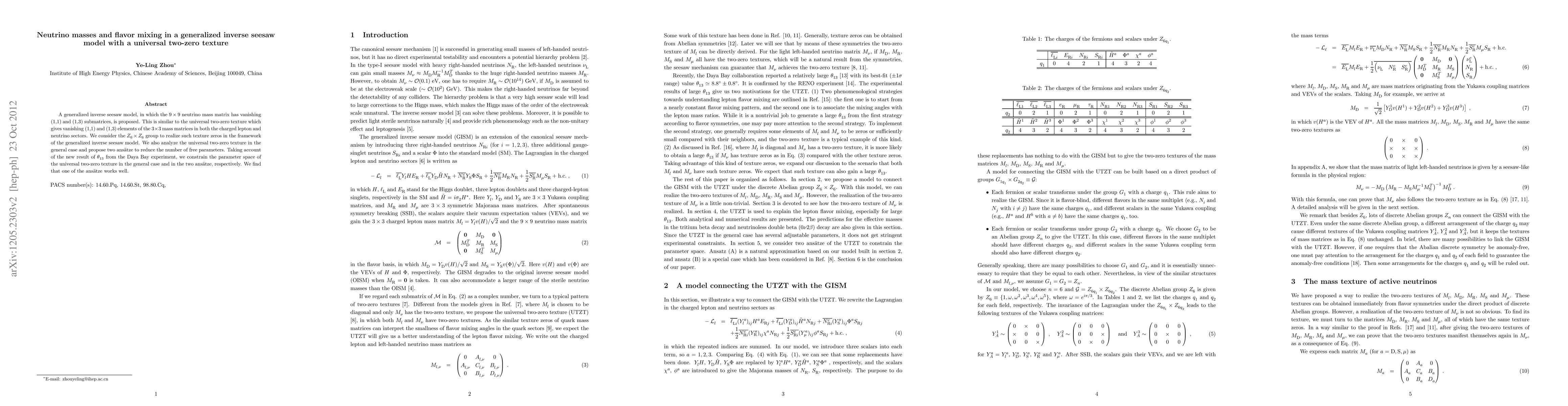 The research proposes a generalized inverse seesaw model with a universal two-zero texture, utilizing the Z_6 x Z_6 group to realize texture zeros, and derives the seesaw formula for the 3x3 mass matrix of three active neutrinos.