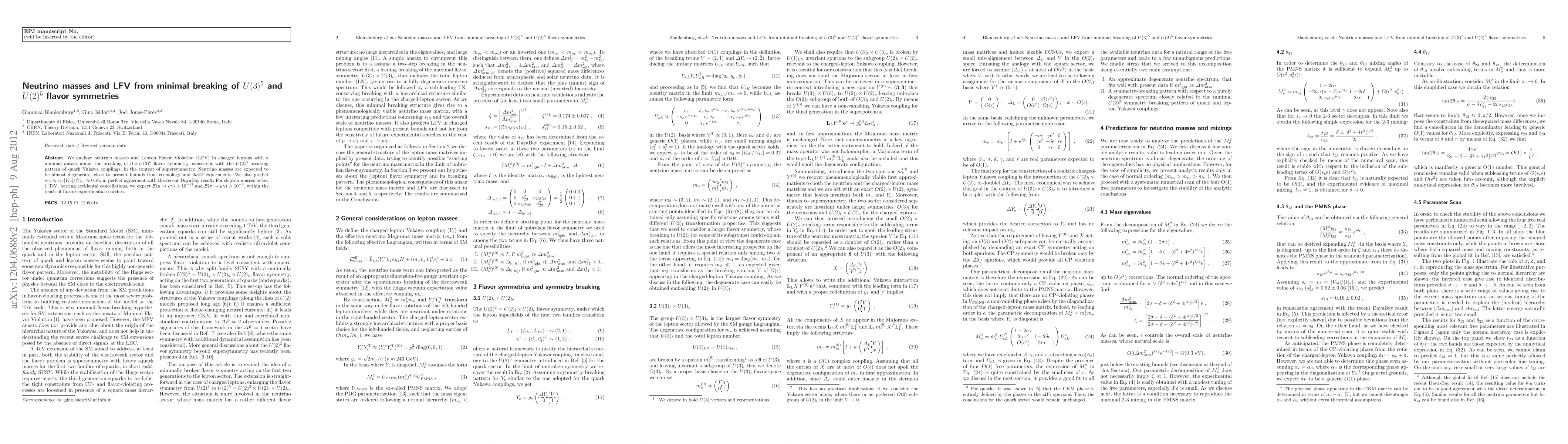 The paper proposes a minimal symmetry-breaking scenario for U(3)^5 and U(2)^3, predicting nearly degenerate neutrino masses within cosmological and 0νββ bounds. It aligns s13 with DayaBay results (~0.16) and forecasts LFV rates like μ→eγ > 10^-13 and τ→μγ > 10^-9 for slepton masses <1 TeV, accessible to future experiments.