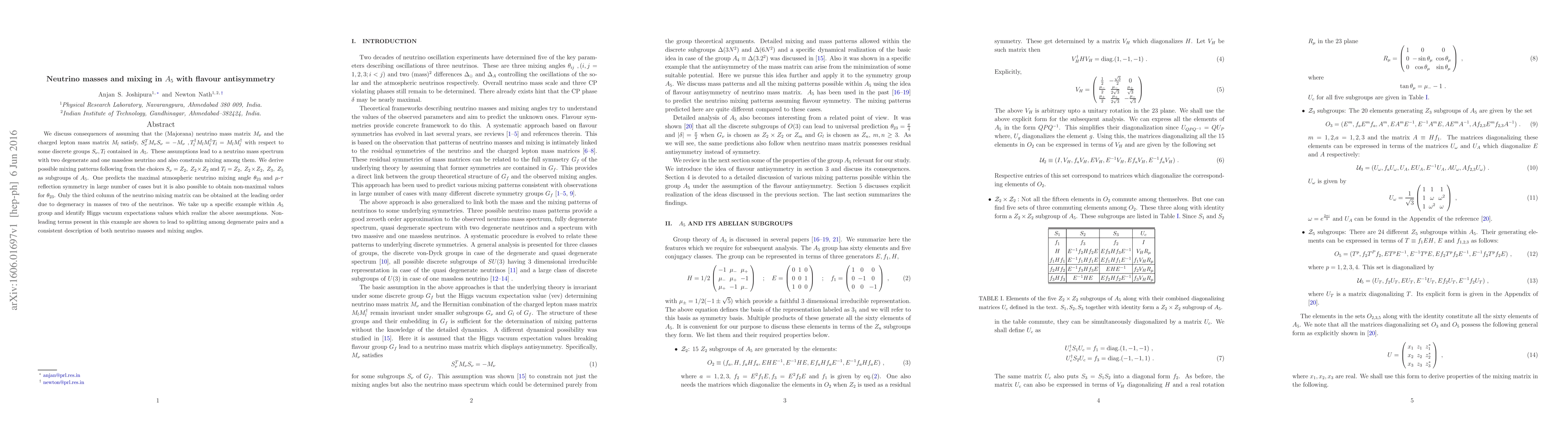 This paper explores the implications of imposing flavour antisymmetry conditions on neutrino and charged lepton mass matrices within the $A_5$ symmetry framework, predicting a neutrino mass spectrum with two degenerate and one massless neutrino, and deriving specific mixing patterns. It finds that maximal atmospheric neutrino mixing angle and $\mu$-$\tau$ reflection symmetry are common, but non-maximal values are also possible.