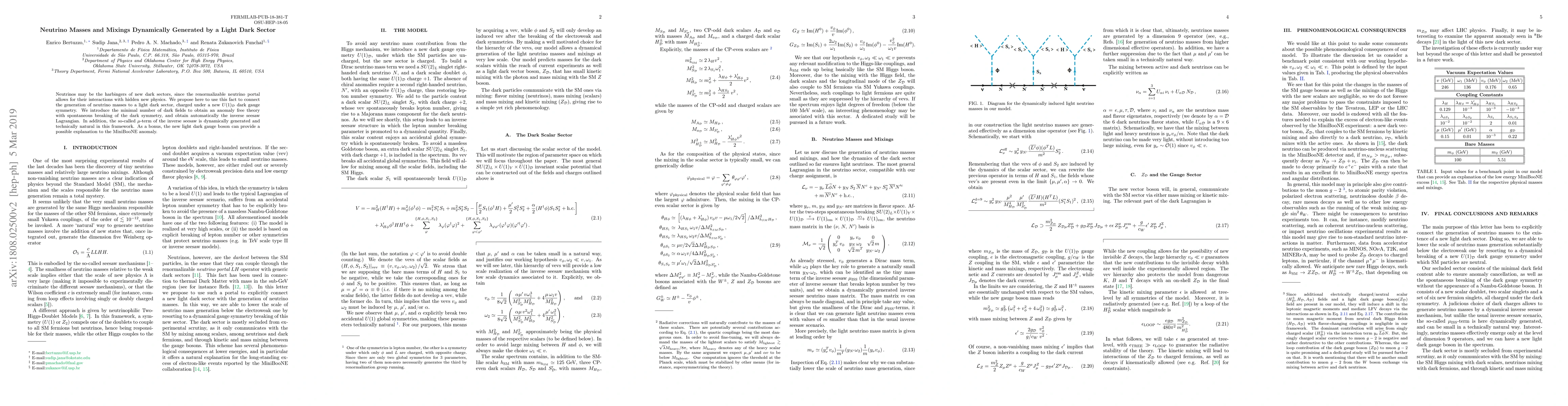 This paper proposes a model where neutrino masses and mixings arise dynamically through interactions with a light dark sector governed by a new $U(1)_{\cal D}$ gauge symmetry. The model introduces minimal dark fields, achieves anomaly cancellation, and naturally generates the inverse seesaw mechanism, potentially explaining the MiniBooNE anomaly.
