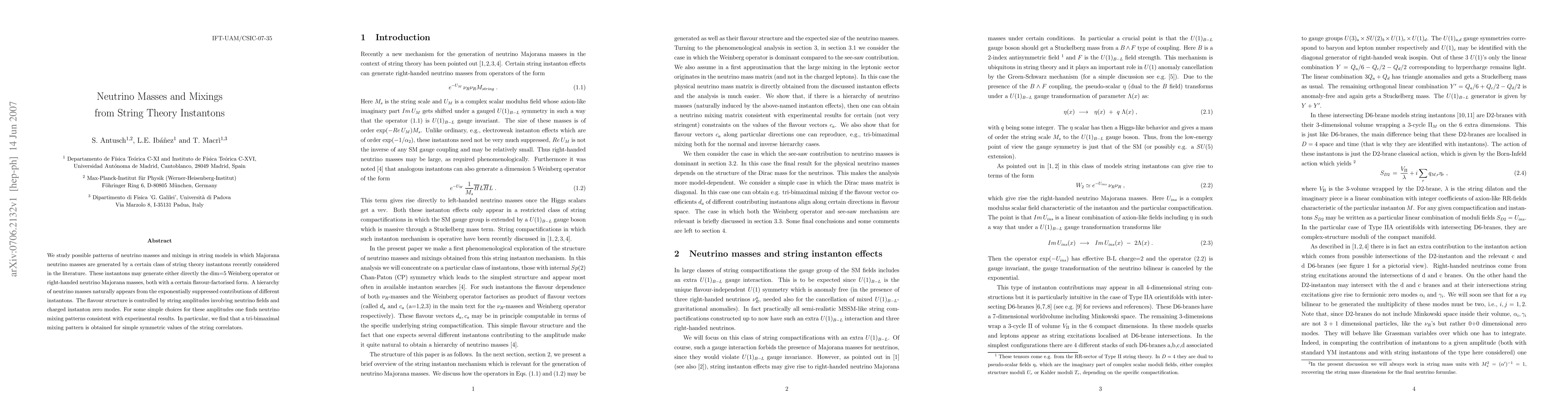 This paper explores neutrino masses and mixings in string theory models, where Majorana masses arise from specific instantons. It demonstrates how these instantons generate a hierarchy of neutrino masses and aligns the flavour structure with string amplitudes, resulting in mixing patterns consistent with experiments, including a tri-bimaximal pattern for certain correlator values.