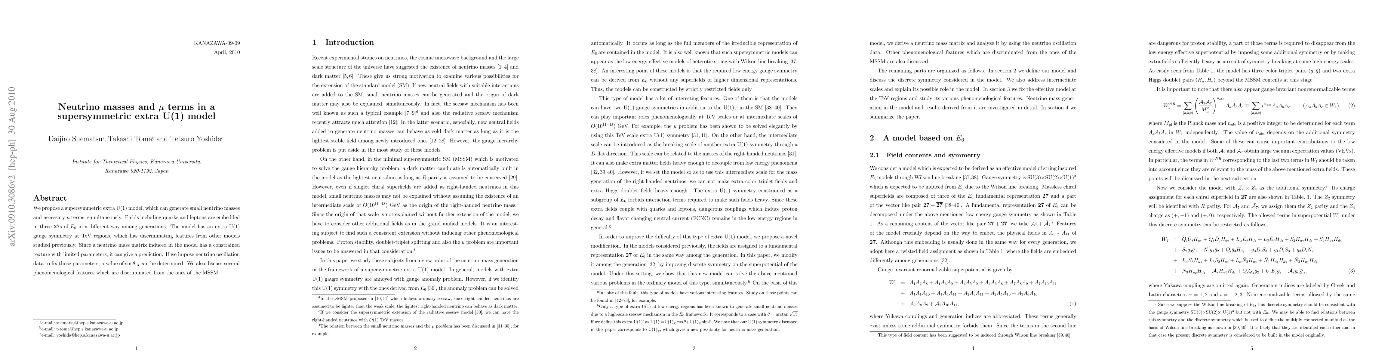 This research proposes a supersymmetric extra U(1) model that generates small neutrino masses and necessary $mu$ terms simultaneously. The model, based on $E_6$ embeddings, predicts a value of $sin heta_{13}$ when neutrino oscillation data is applied, distinguishing it from the MSSM with unique phenomenological features.