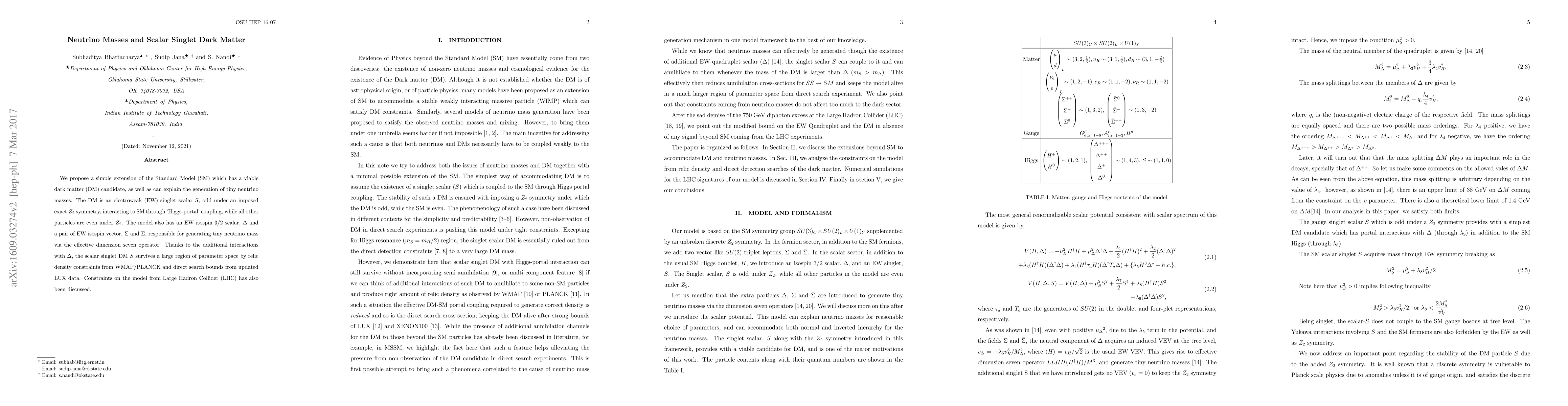 This paper proposes a Standard Model extension featuring a scalar singlet dark matter candidate and explains tiny neutrino masses via an effective dimension seven operator. The dark matter candidate, $S$, interacts with the Higgs via a Higgs-portal and satisfies relic density and direct search constraints.