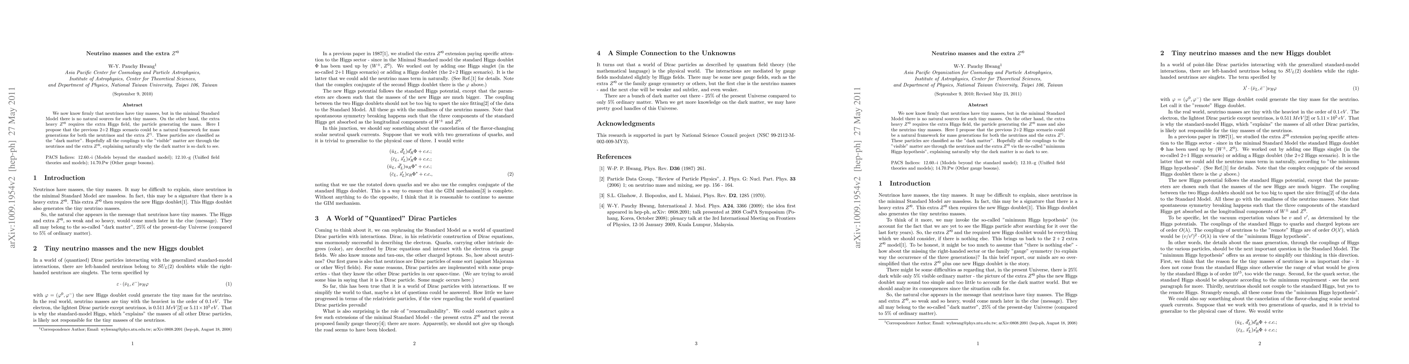 The paper proposes a framework where the minimal Standard Model's inability to naturally explain tiny neutrino masses is resolved by introducing an extra heavy Z'0. This Z'0, arising from an additional Higgs field, could also serve as 'dark matter', interacting primarily through neutrinos, thereby explaining dark matter's elusive nature.