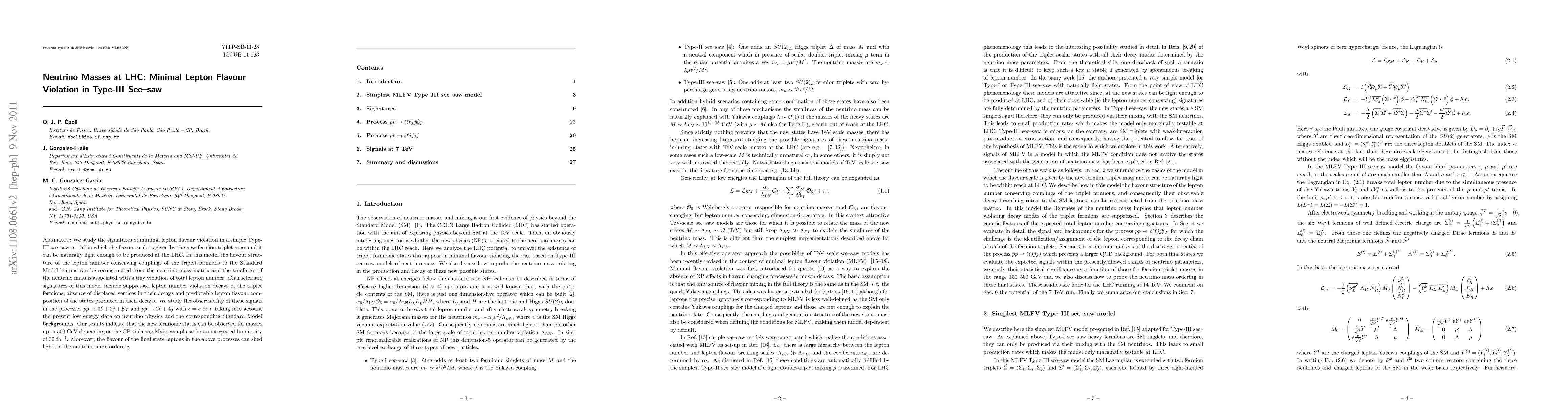 This paper investigates minimal lepton flavour violation in a Type-III see-saw model at the LHC, focusing on the observability of new fermionic triplet states up to 500 GeV. The study highlights characteristic signatures such as suppressed lepton number violation and predictable lepton flavour composition, which can help determine the neutrino mass ordering.