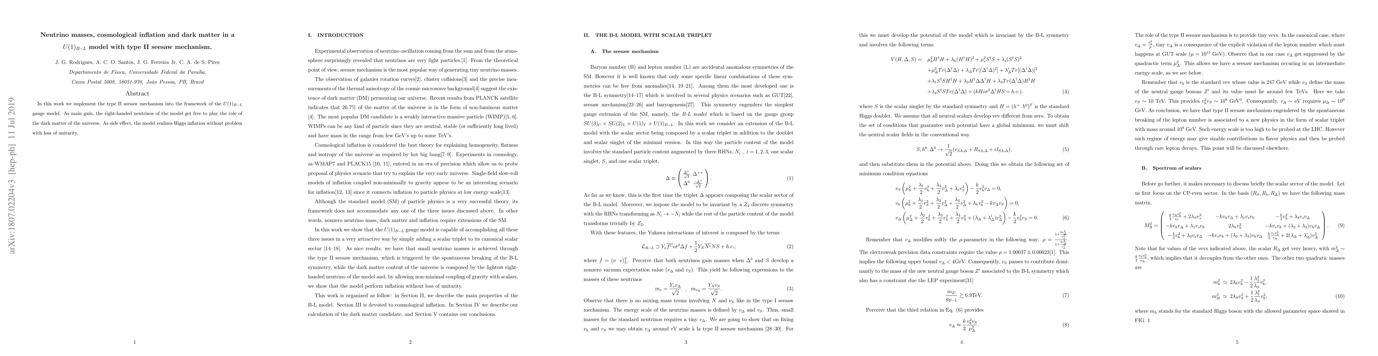 In this work we implement the type II seesaw mechanism into the framework of the $U(1)_{B-L}$ gauge model. As main gain, the right-handed neutrinos of the model get free to play the role of the dark matter of the universe. As side effect, the model realizes Higgs inflation without problem with loss of unitarity.