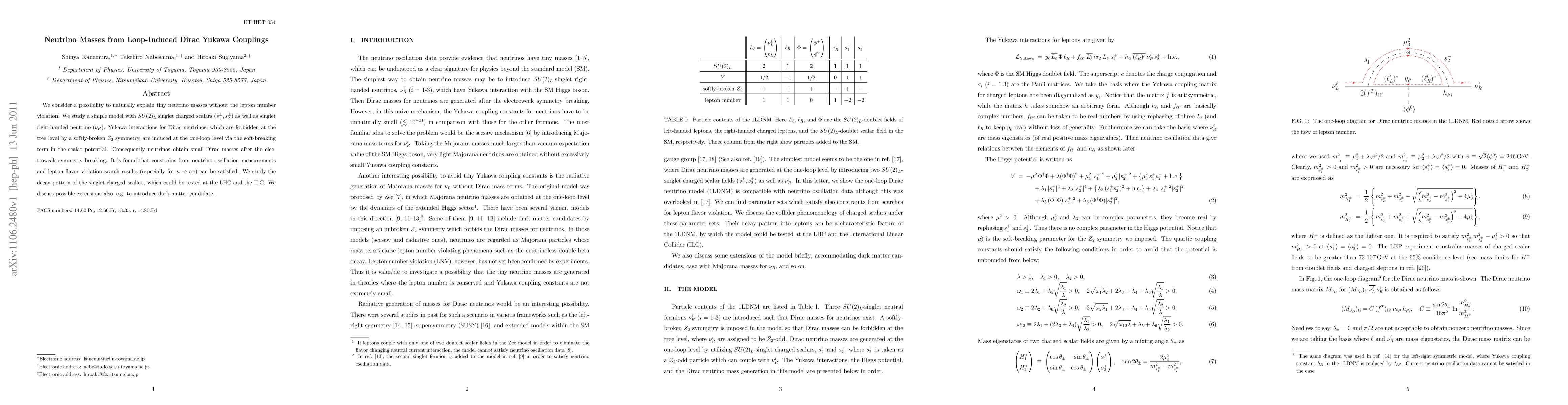 We consider a possibility to naturally explain tiny neutrino masses without the lepton number violation. We study a simple model with SU(2)_L singlet charged scalars (s_1^+, s_2^+) as well as singlet right-handed neutrino (nu_R). Yukawa interactions for Dirac neutrinos, which are forbidden at the tree level by a softly-broken Z_2 symmetry, are induced at the one-loop level via the soft-breaking term in the scalar potential. Consequently neutrinos obtain small Dirac masses after the electroweak symmetry breaking. It is found that constrains from neutrino oscillation measurements and lepton flavor violation search results (especially for mu to e gamma) can be satisfied. We study the decay pattern of the singlet charged scalars, which could be tested at the LHC and the ILC. We discuss possible extensions also, e.g. to introduce dark matter candidate.