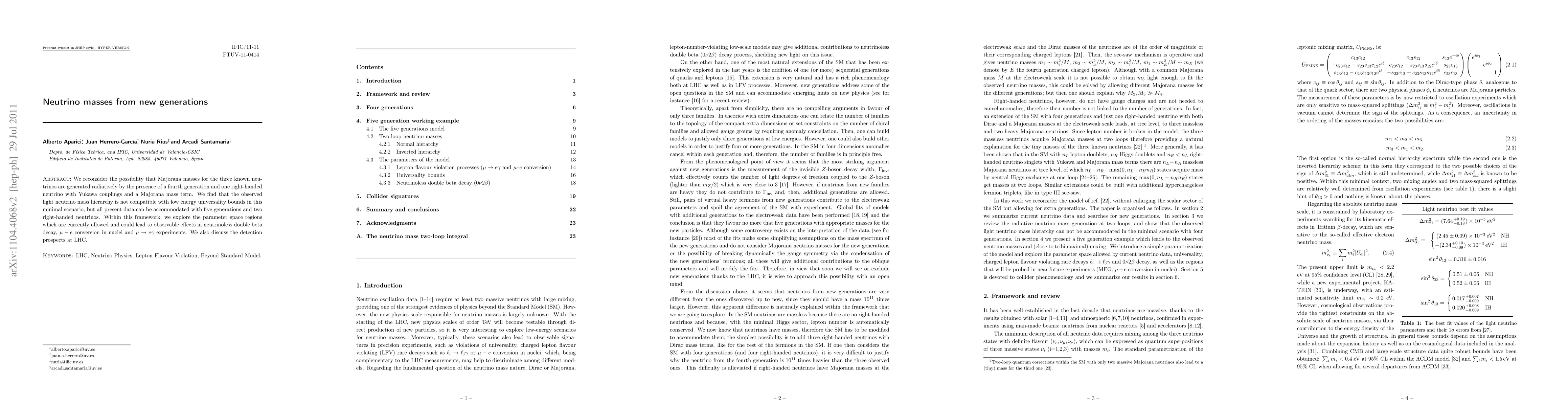 We reconsider the possibility that Majorana masses for the three known neutrinos are generated radiatively by the presence of a fourth generation and one right-handed neutrino with Yukawa couplings and a Majorana mass term. We find that the observed light neutrino mass hierarchy is not compatible with low energy universality bounds in this minimal scenario, but all present data can be accommodated with five generations and two right-handed neutrinos. Within this framework, we explore the parameter space regions which are currently allowed and could lead to observable effects in neutrinoless double beta decay, $\mu - e$ conversion in nuclei and $\mu \rightarrow e \gamma$ experiments. We also discuss the detection prospects at LHC.