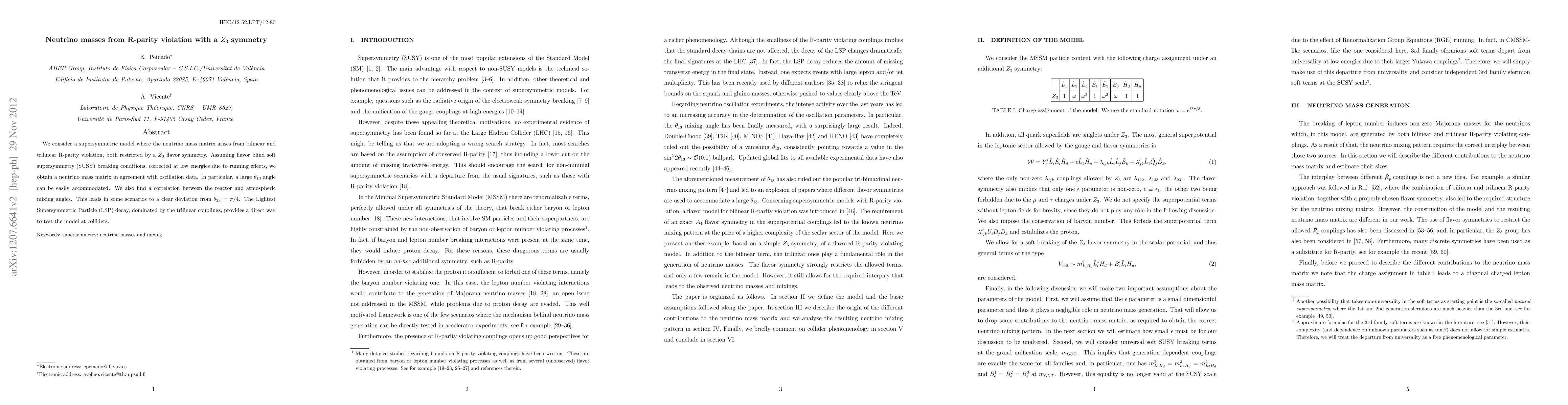 We consider a supersymmetric model where the neutrino mass matrix arises from bilinear and trilinear R-parity violation, both restricted by a $Z_3$ flavor symmetry. Assuming flavor blind soft supersymmetry (SUSY) breaking conditions, corrected at low energies due to running effects, we obtain a neutrino mass matrix in agreement with oscillation data. In particular, a large $\theta_{13}$ angle can be easily accommodated. We also find a correlation between the reactor and atmospheric mixing angles. This leads in some scenarios to a clear deviation from $\theta_{23} = \pi/4$. The Lightest Supersymmetric Particle (LSP) decay, dominated by the trilinear couplings, provides a direct way to test the model at colliders.