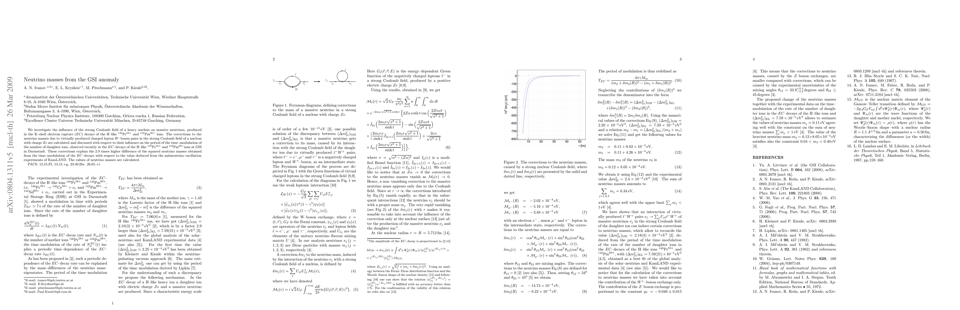 We investigate the influence of the strong Coulomb field of a heavy nucleus on massive neutrinos, produced in the K-shell electron capture (EC) decays of the H-like 140Pr58+ and 142Pm60+ ions. The corrections to the neutrino masses due to virtually produced charged lepton W-boson pairs in the strong Coulomb field of a nucleus with charge Ze are calculated and discussed with respect to their influence on the period of the time-modulation of the number of daughter ions, observed recently in the EC-decays of the H-like 140Pr58+ and 142Pm60+ ions at GSI in Darmstadt. These corrections explain the 2.9 times higher difference of the squared neutrino masses obtained from the time-modulation of the EC-decays with respect to the value deduced from the antineutrino-oscillation experiments of KamLAND.