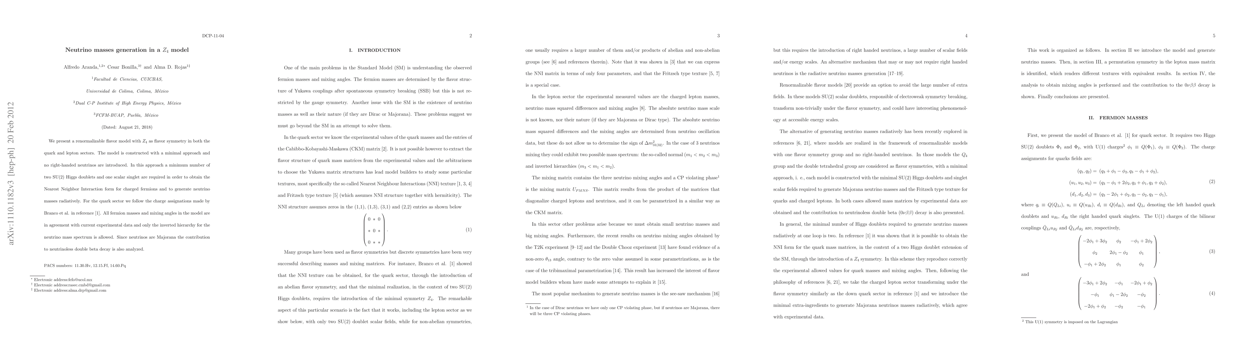 We present a renormalizable flavor model with Z_4 as flavor symmetry in both the quark and lepton sectors. The model is constructed with a minimal approach and no-right handed neutrinos are introduced. In this approach a minimum number of two SU(2) Higgs doublets and one scalar singlet are required in order to obtain the Nearest Neighbor Interaction form for charged fermions and to generate neutrino masses radiatively. For the quark sector we follow the charge assignations made by Branco et. al. in reference [1]. All fermion masses and mixing angles in the model are in agreement with current experimental data and only the inverted hierarchy for the neutrino mass spectrum is allowed. Since neutrinos are Majorana the contribution to neutrinoless double beta decay is also analyzed.