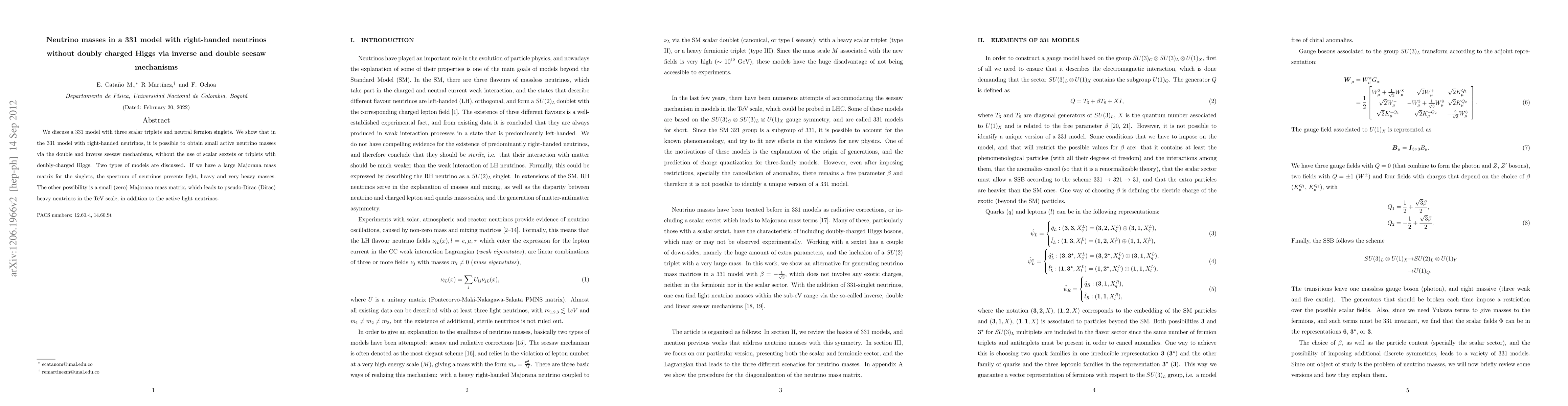 We discuss a 331 model with three scalar triplets and neutral fermion singlets. We show that in the 331 model with right-handed neutrinos, it is possible to obtain small active neutrino masses via the double and inverse seesaw mechanisms, without the use of scalar sextets or triplets with doubly-charged Higgs. Two types of models are discussed. If we have a large Majorana mass matrix for the singlets, the spectrum of neutrinos presents light, heavy and very heavy masses. The other possibility is a small (zero) Majorana mass matrix, which leads to pseudo-Dirac (Dirac) heavy neutrinos in the TeV scale, in addition to the active light neutrinos