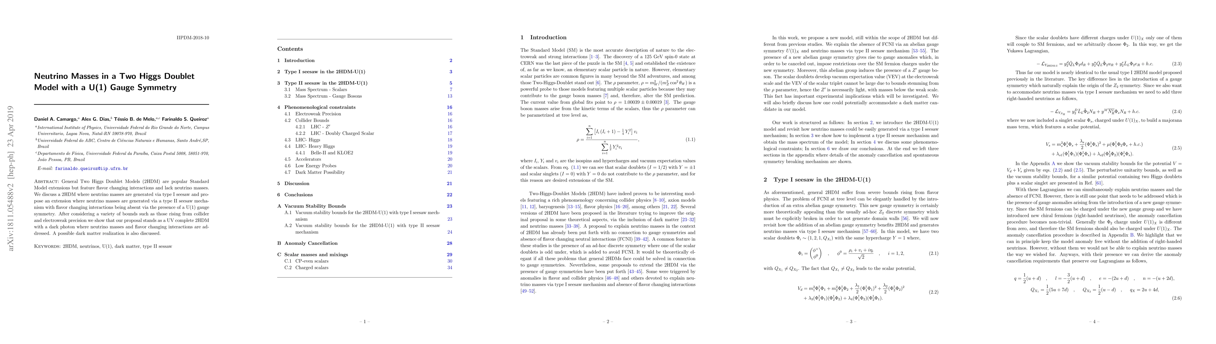A Two Higgs Doublet Model with a U(1) gauge symmetry generates neutrino masses via type II seesaw mechanism, addressing flavor changing interactions and electroweak precision bounds, and offers a dark photon realization.