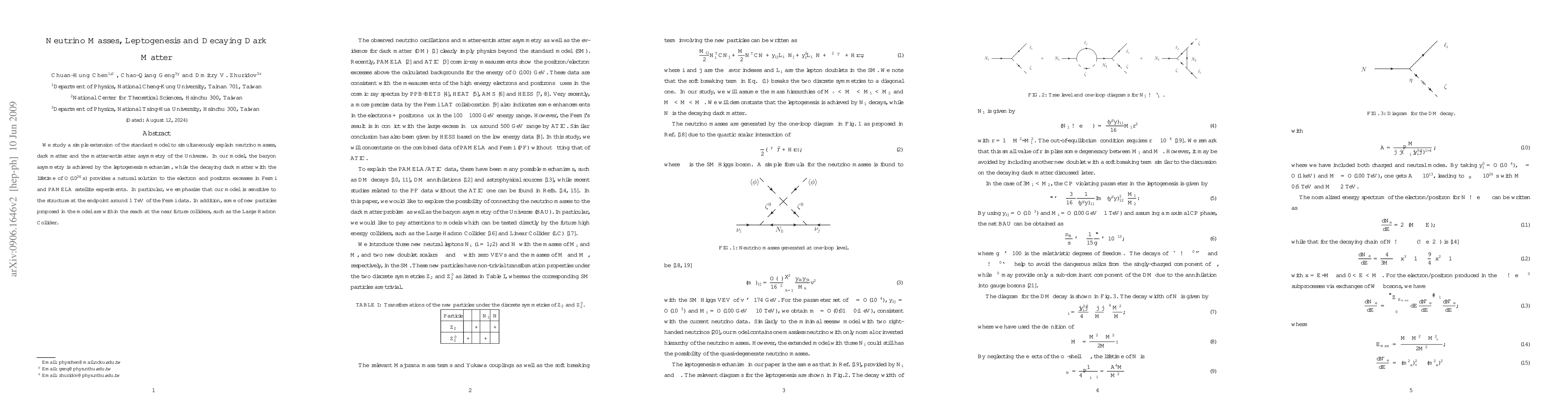 This paper proposes an extension of the standard model to explain neutrino masses, dark matter, and the matter-antimatter asymmetry via leptogenesis. It suggests decaying dark matter as a solution to observed electron and positron excesses, with implications for Fermi data and potential detection at future colliders.