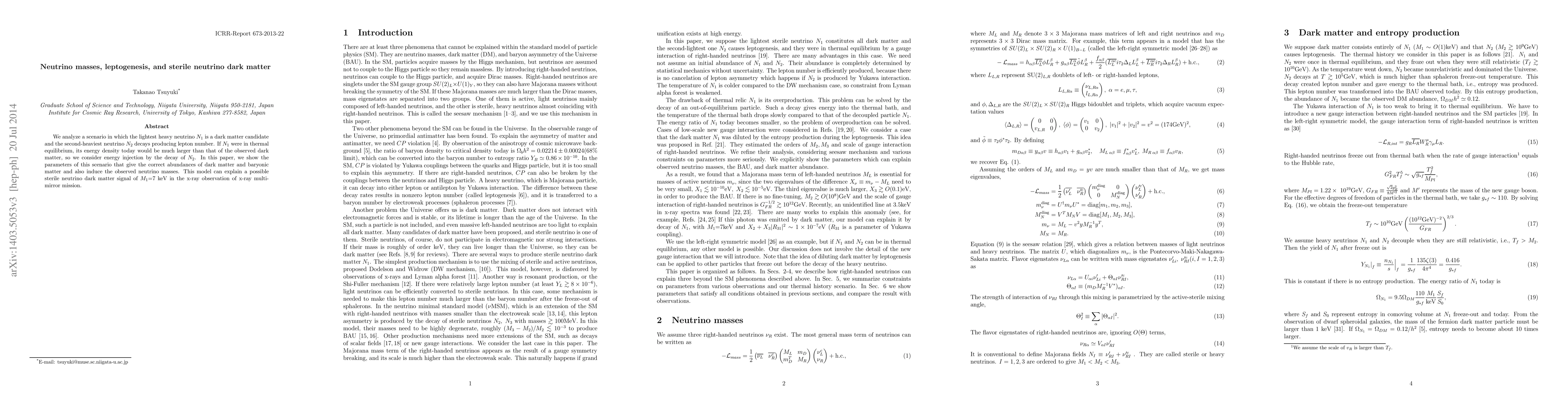 We analyze a scenario in which the lightest heavy neutrino $N_1$ is a dark matter candidate and the second- heaviest neutrino $N_2$ decays producing a lepton number. If $N_1$ were in thermal equilibrium, its energy density today would be much larger than that of the observed dark matter, so we consider energy injection by the decay of $N_2$. In this paper, we show the parameters of this scenario that give the correct abundances of dark matter and baryonic matter and also induce the observed neutrino masses. This model can explain a possible sterile neutrino dark matter signal of $M_1$=7 keV in the x-ray observation of x-ray multi-mirror mission.