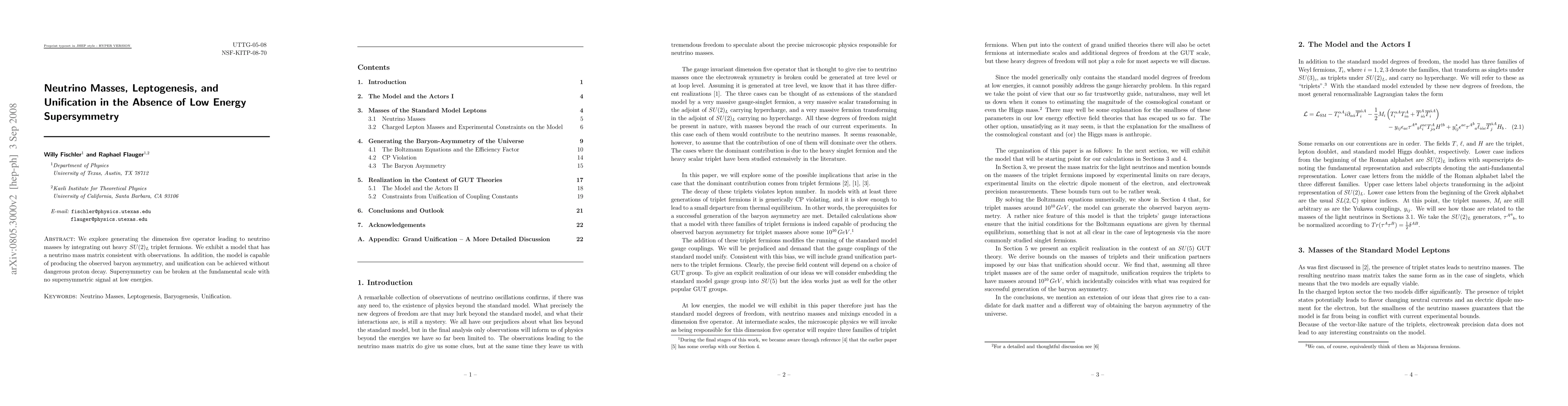 We explore generating the dimension five operator leading to neutrino masses by integrating out heavy SU(2)_L triplet fermions. We exhibit a model that has a neutrino mass matrix consistent with observations. In addition, the model is capable of producing the observed baryon asymmetry, and unification can be achieved without dangerous proton decay. Supersymmetry can be broken at the fundamental scale with no supersymmetric signal at low energies.