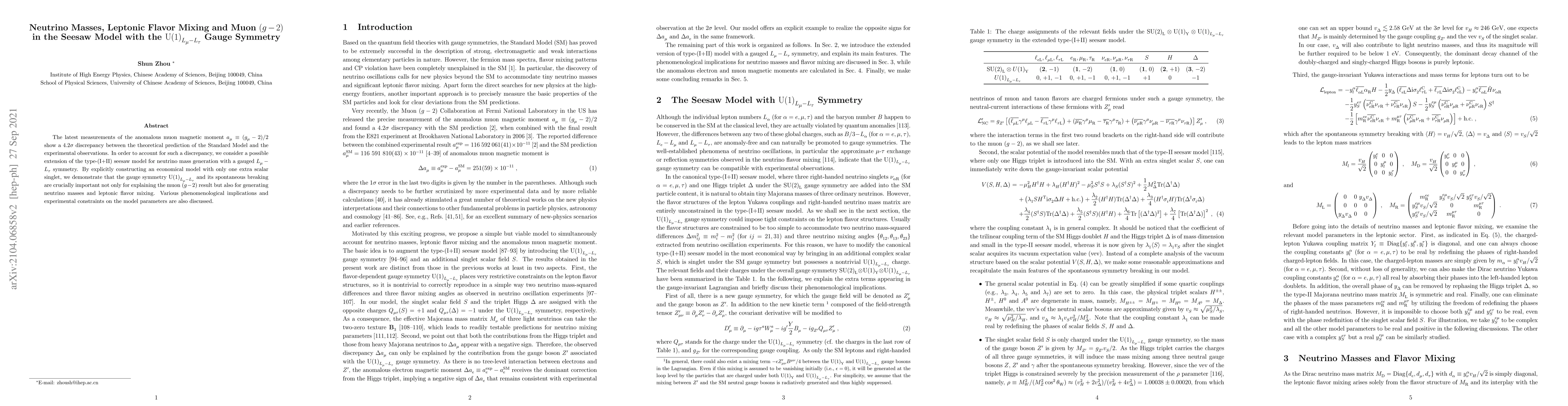 This paper proposes an extension of the type-(I+II) seesaw model with a gauged $U(1)_{L_\mu-L_\tau}$ symmetry to explain the $4.2\sigma$ discrepancy in the anomalous muon magnetic moment, generate neutrino masses, and determine leptonic flavor mixing. The model introduces a single extra scalar singlet and discusses its phenomenological implications and experimental constraints.