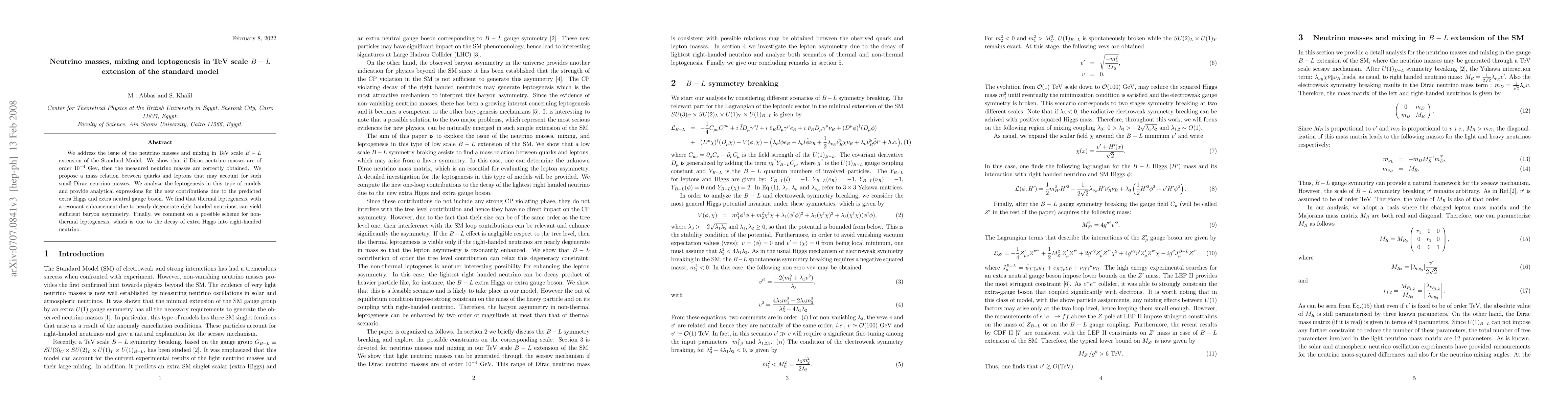 This paper explores neutrino masses and mixing within a TeV scale $B-L$ extension of the Standard Model, demonstrating that small Dirac neutrino masses of order $10^{-4}$ GeV can generate the observed neutrino masses. It also investigates leptogenesis, showing that thermal processes with resonant enhancements can produce the necessary baryon asymmetry.