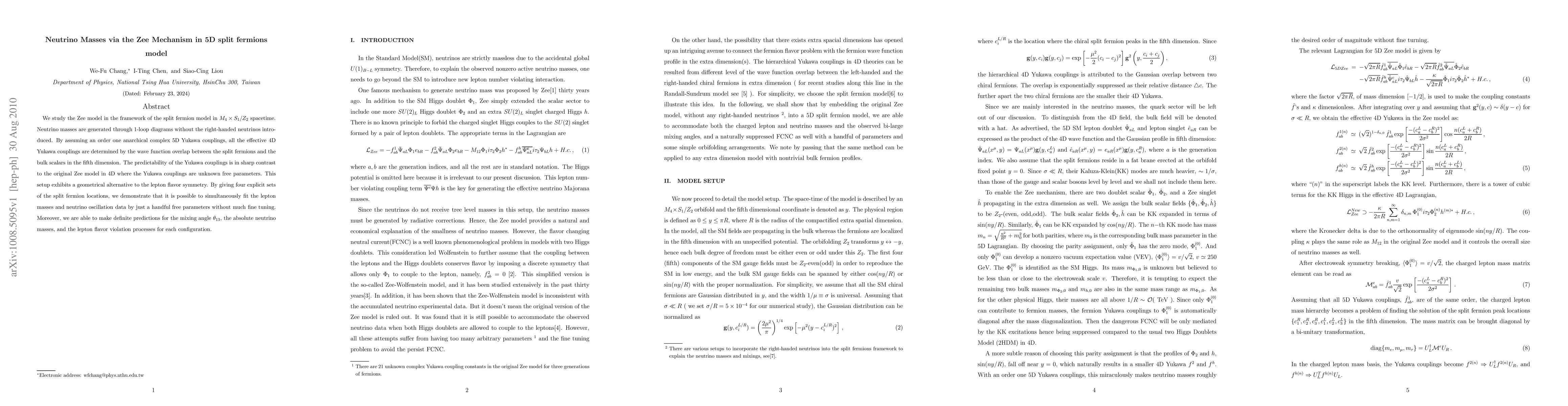 This paper explores the Zee mechanism for neutrino mass generation within a 5D split fermion model, showing how 1-loop diagrams yield masses without right-handed neutrinos. It predicts 4D Yukawa couplings based on 5D geometry, contrasting with the free parameters in the 4D Zee model, and demonstrates fitting of lepton masses and oscillation data with minimal fine-tuning.