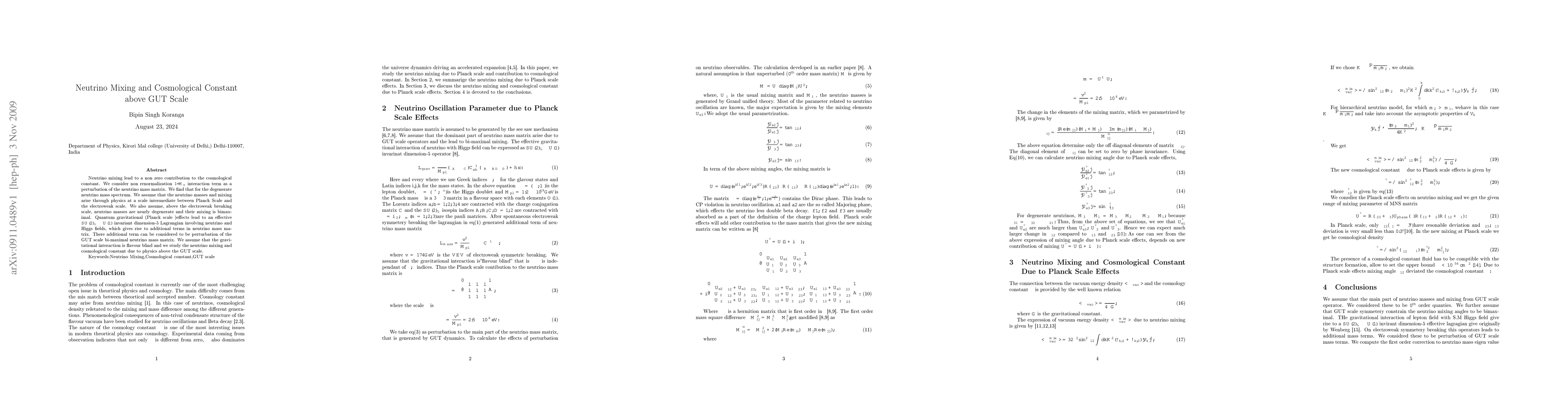 Neutrino mixing lead to a non zero contribution to the cosmological constant. We consider non renormalization $1/M_{x}$ interaction term as a perturbation of the neutrino mass matrix. We find that for the degenerate neutrino mass spectrum. We assume that the neutrino masses and mixing arise through physics at a scale intermediate between Planck Scale and the electroweak scale. We also assume, above the electroweak breaking scale, neutrino masses are nearly degenerate and their mixing is bimaximal. Quantum gravitational (Planck scale )effects lead to an effective $SU(2)_{L}\times U(1)$ invariant dimension-5 Lagrangian involving neutrino and Higgs fields, which gives rise to additional terms in neutrino mass matrix. There additional term can be considered to be perturbation of the GUT scale bi-maximal neutrino mass matrix. We assume that the gravitational interaction is flavour blind and we study the neutrino mixing and cosmological constant due to physics above the GUT scale.
