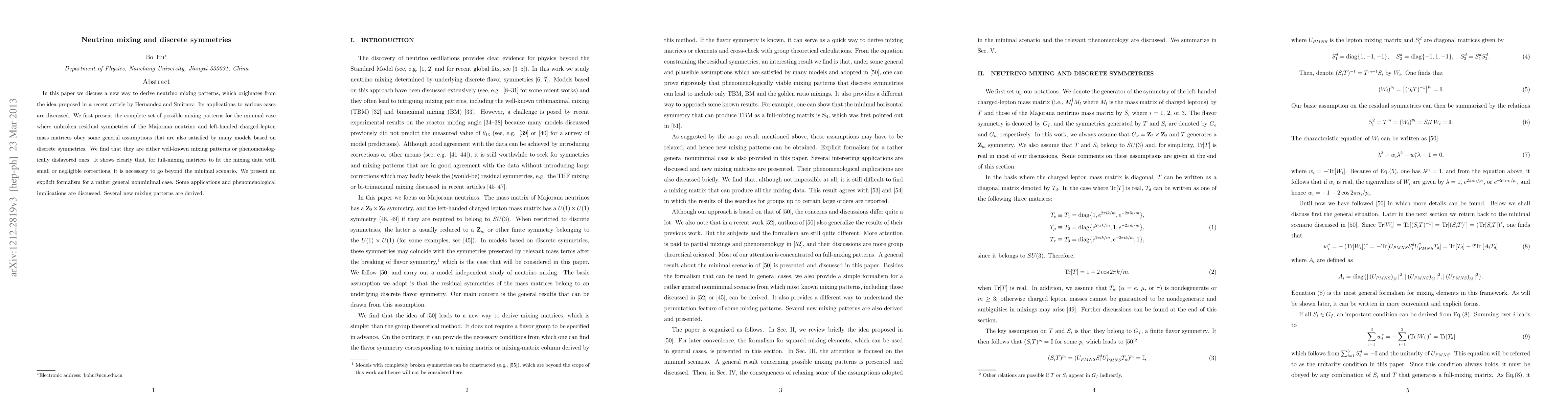 This paper proposes a novel method to derive neutrino mixing patterns based on discrete symmetries, extending beyond minimal assumptions. It explores the implications of these patterns and finds that new mixing patterns emerge, suggesting the necessity of nonminimal scenarios to fit observed mixing data accurately.
