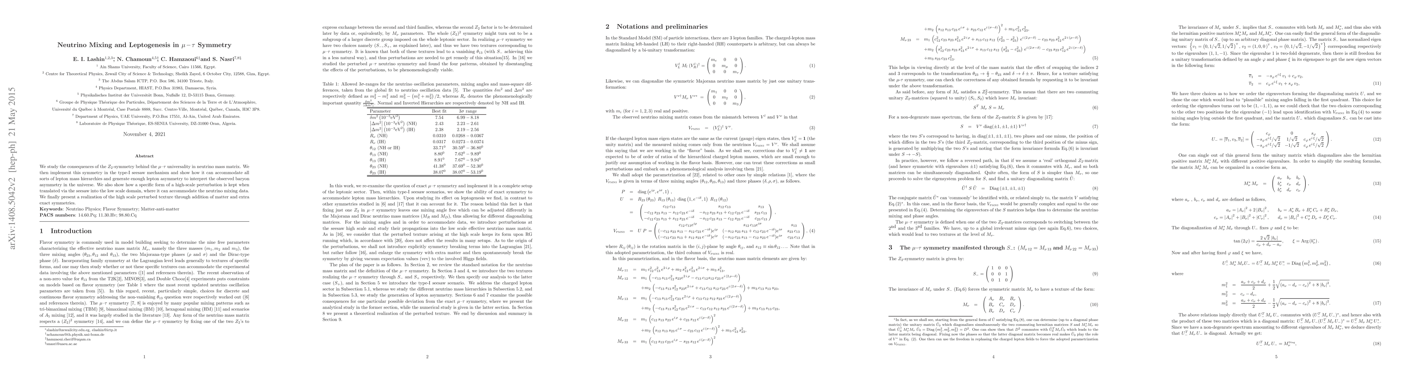 We study the consequences of the $Z_2$-symmetry behind the $\mu$--$\tau$ universality in neutrino mass matrix. We then implement this symmetry in the type-I seesaw mechanism and show how it can accommodate all sorts of lepton mass hierarchies and generate enough lepton asymmetry to interpret the observed baryon asymmetry in the universe. We also show how a specific form of a high-scale perturbation is kept when translated via the seesaw into the low scale domain, where it can accommodate the neutrino mixing data. We finally present a realization of the high scale perturbed texture through addition of matter and extra exact symmetries.